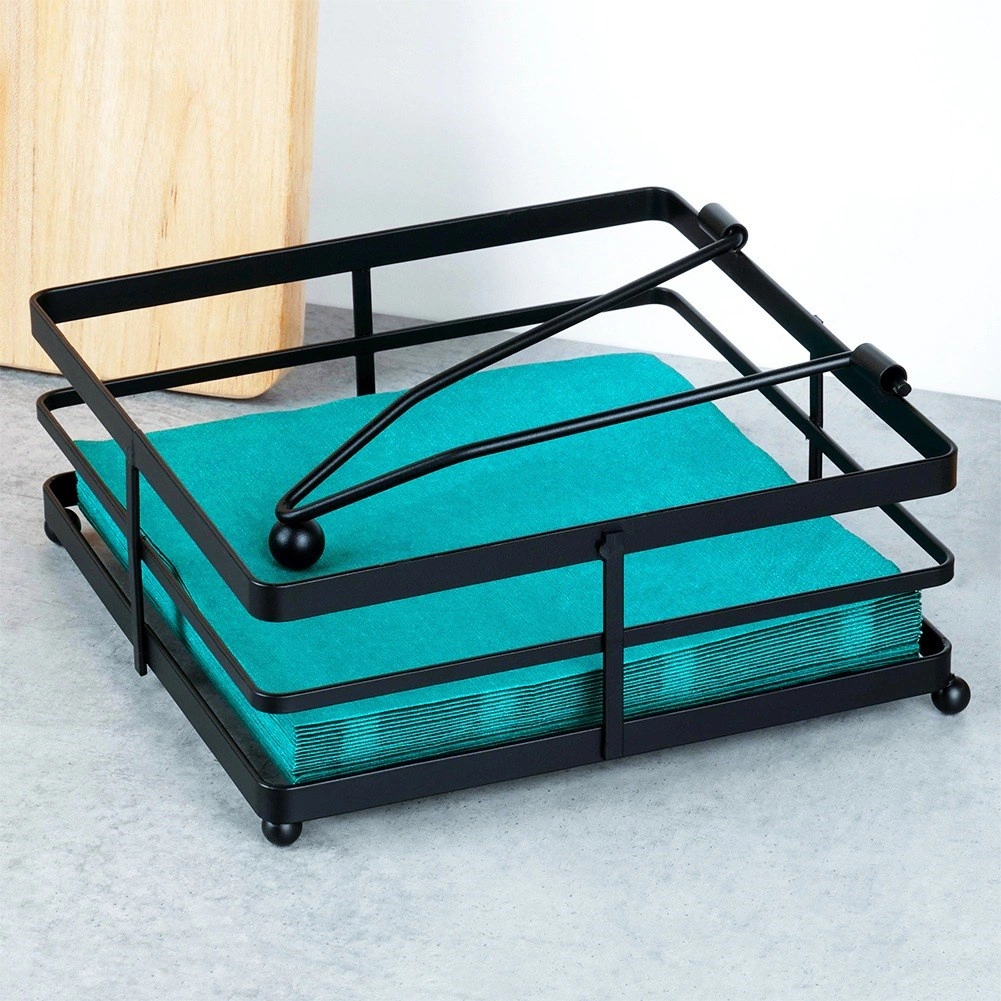 Elegantný kovový stojan na servítky s prítlakom udrží servítky vždy na svojom mieste – doma aj vonku. Má robustnú konštrukciu z práškovo lakovaného kovu v matnej čiernej farbe a rozmery 18 × 18 × 7 cm. Ideálny do kuchyne, jedálne, na záhradu či terasu. Stabilné zaťažené rameno, odolný kov a univerzálne použitie z neho robia praktický aj dekoratívny doplnok.