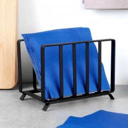 Stojan na obrúsky Misty spája funkčnosť a štýl. Je vyrobený z kvalitného kovu s čiernym matným práškovým lakom, ktorý je odolný proti poškriabaniu a ľahko sa udržiava. Otvorená konštrukcia drží obrúsky vzpriamene a umožňuje ich rýchle a pohodlné odoberanie.