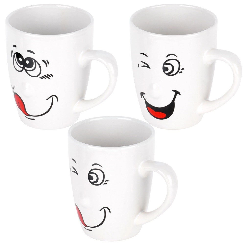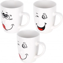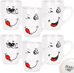 Štýlová sada šiestich bielych keramických hrnčekov s humornými potlačami tvárí s objemom 350 ml poteší deti aj dospelých. Vďaka ergonomickému ušku, možnosti umývania v umývačke a vhodnosti do mikrovlnky sú ideálne na každodennú kávu, čaj aj kakao. Klasický tvar a lesklý povrch skvele vyniknú na každom stole.