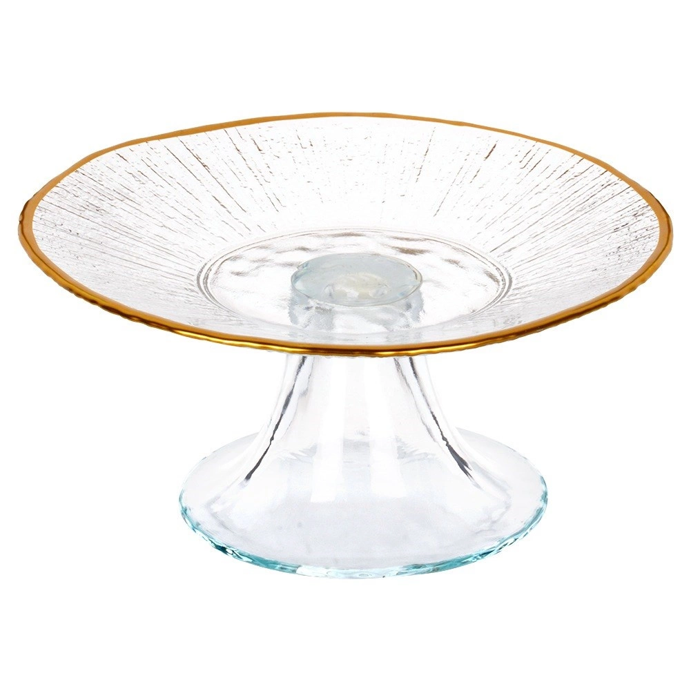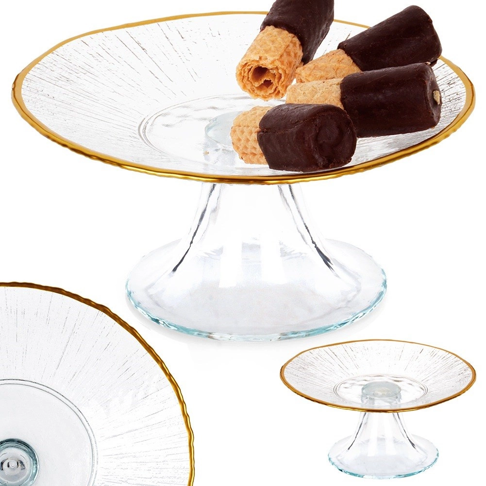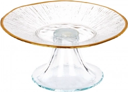 Elegantná sklenená patera na nohe s priemerom 15,5 cm so zlatým okrajom a krištáľovým vzhľadom na štýlové servírovanie. Ideálna na dezerty, torty, ovocie aj jednohubky. Vďaka stabilnému podstavcu krásne zvýrazní vaše dobroty a ozdobí každý stôl.