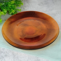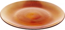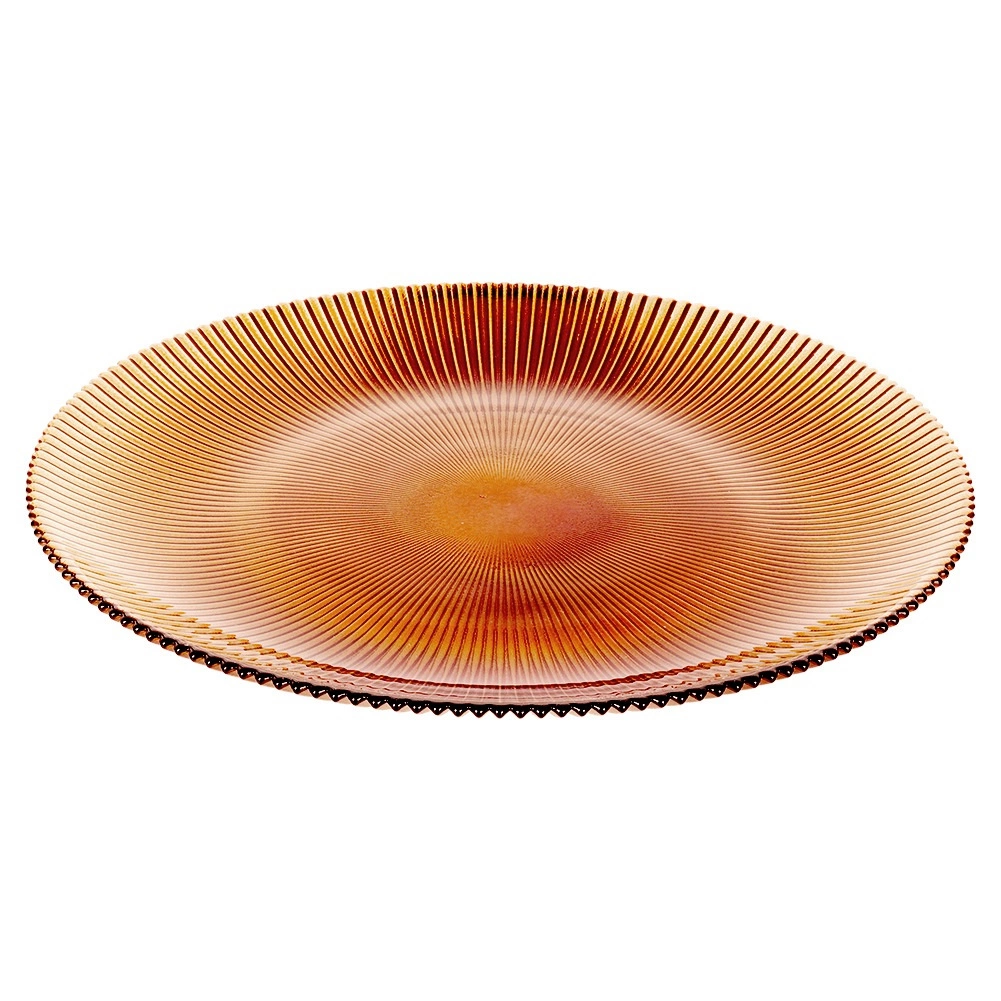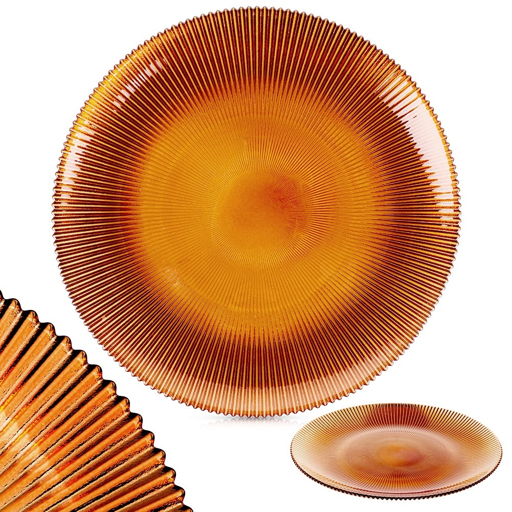 Tento jantárový sklenený tanier 28 cm kombinuje moderný dizajn s funkčnosťou. Radiálne rebrovanie od stredu zabezpečuje atraktívny vzhľad, lepší úchop a krásnu hru svetla. Hodí sa na každodenné stolovanie aj slávnostné príležitosti.