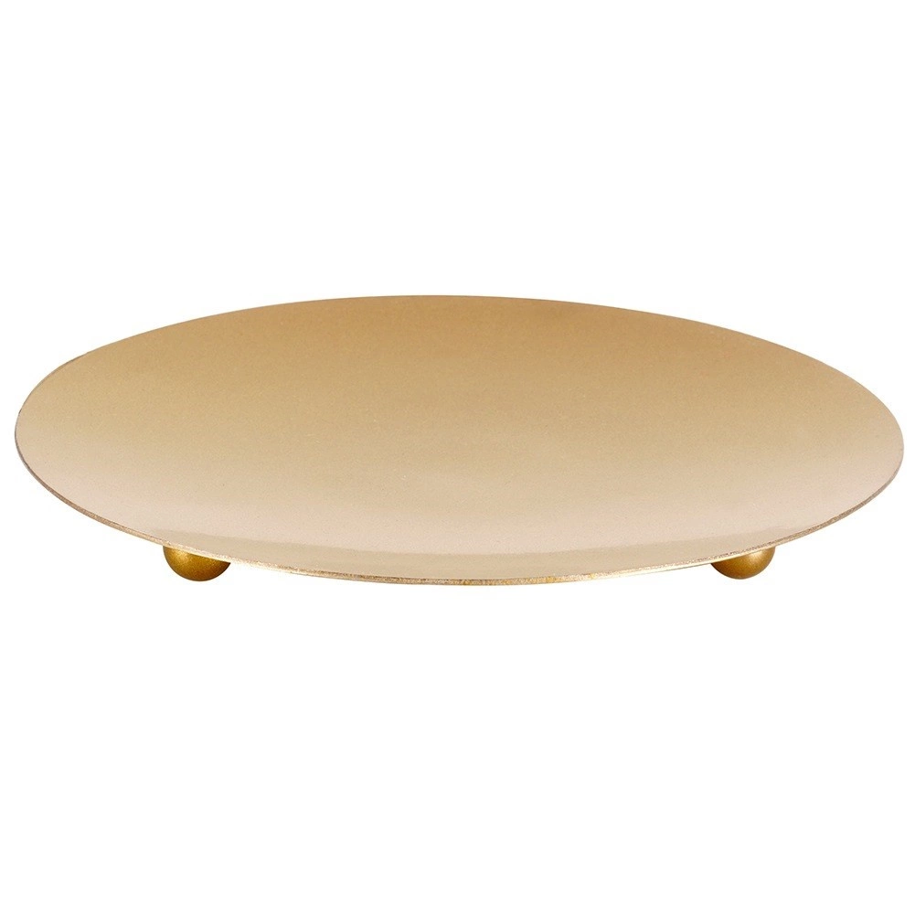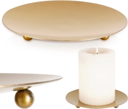 Elegantná kovová podložka pod sviečky s priemerom 12 cm so stabilnými guľôčkovými nožičkami chráni nábytok pred teplom a voskom. Minimalistický dizajn v matnej zlatej farbe dodá interiéru moderný a nadčasový akcent, je odolná, stabilná a skvele sa hodí na dekoratívne aranžmány aj každodenné používanie.