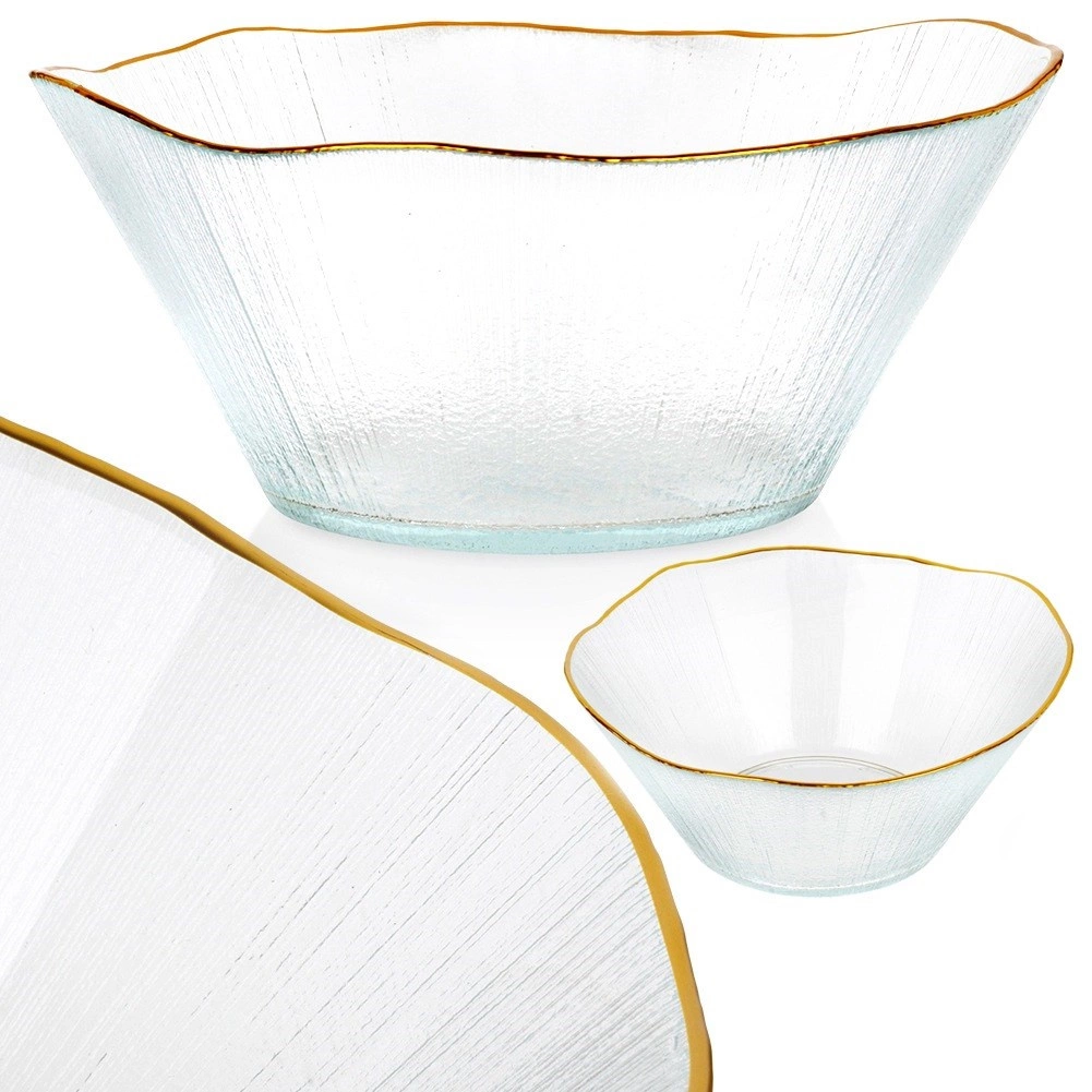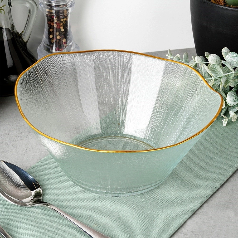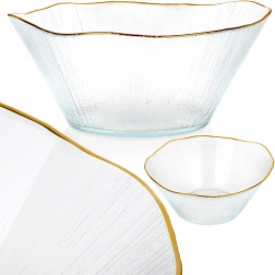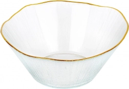 Táto štýlová miska z číreho skla s textúrou imitujúcou krištáľ vyniká luxusným zlatým lemom a širším, zvlneným okrajom, ktorý dodáva servírovaniu výnimočný vzhľad. Vďaka rozmerom 21 × 20 × 9 cm a objemu 1,2 l je ideálna na servírovanie šalátov, ovocia, pochutín či príloh.