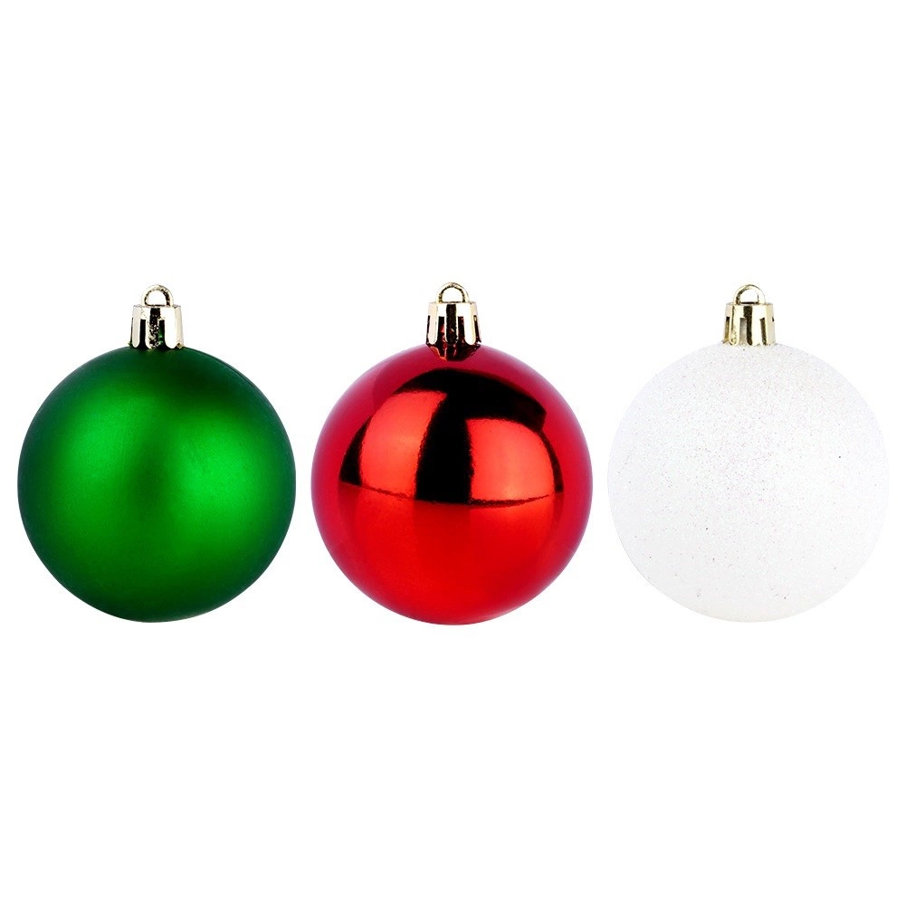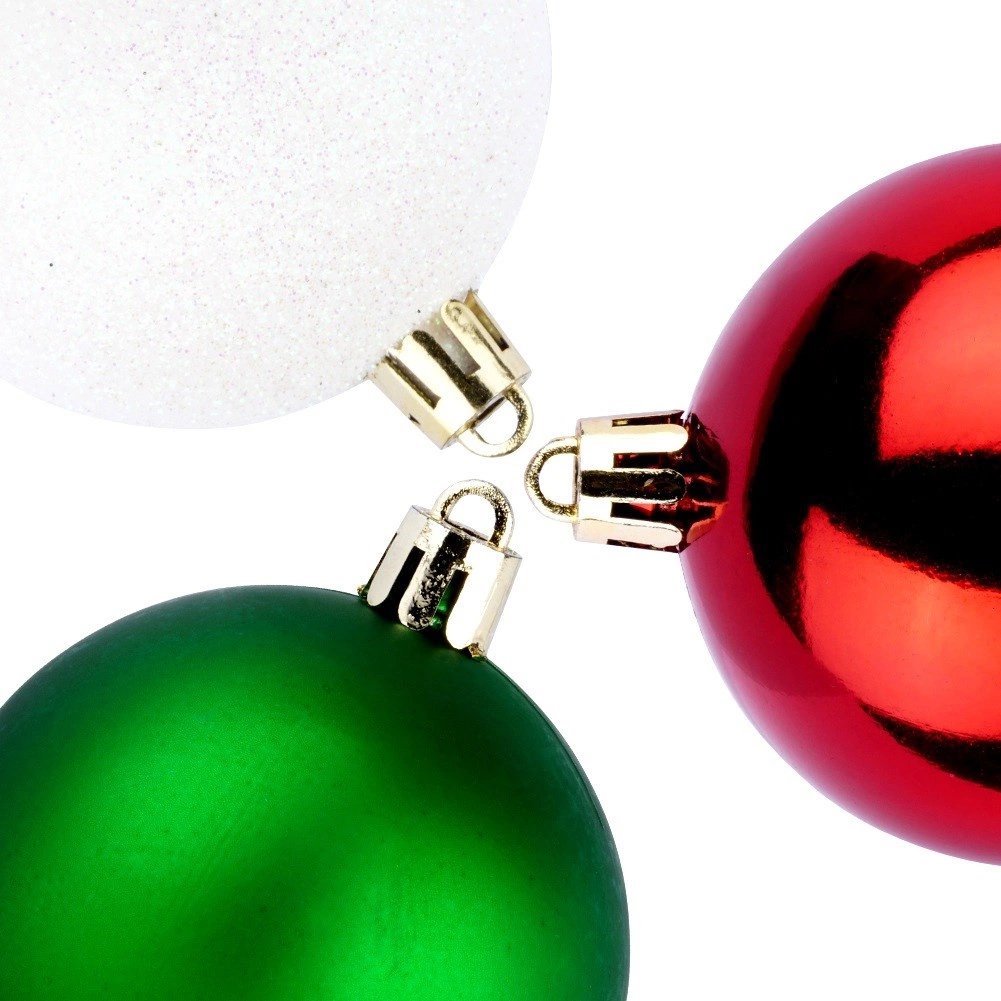 Lesklé červené, matné zelené a biele trblietavé gule vytvárajú krásny kontrast a slávnostný lesk.
