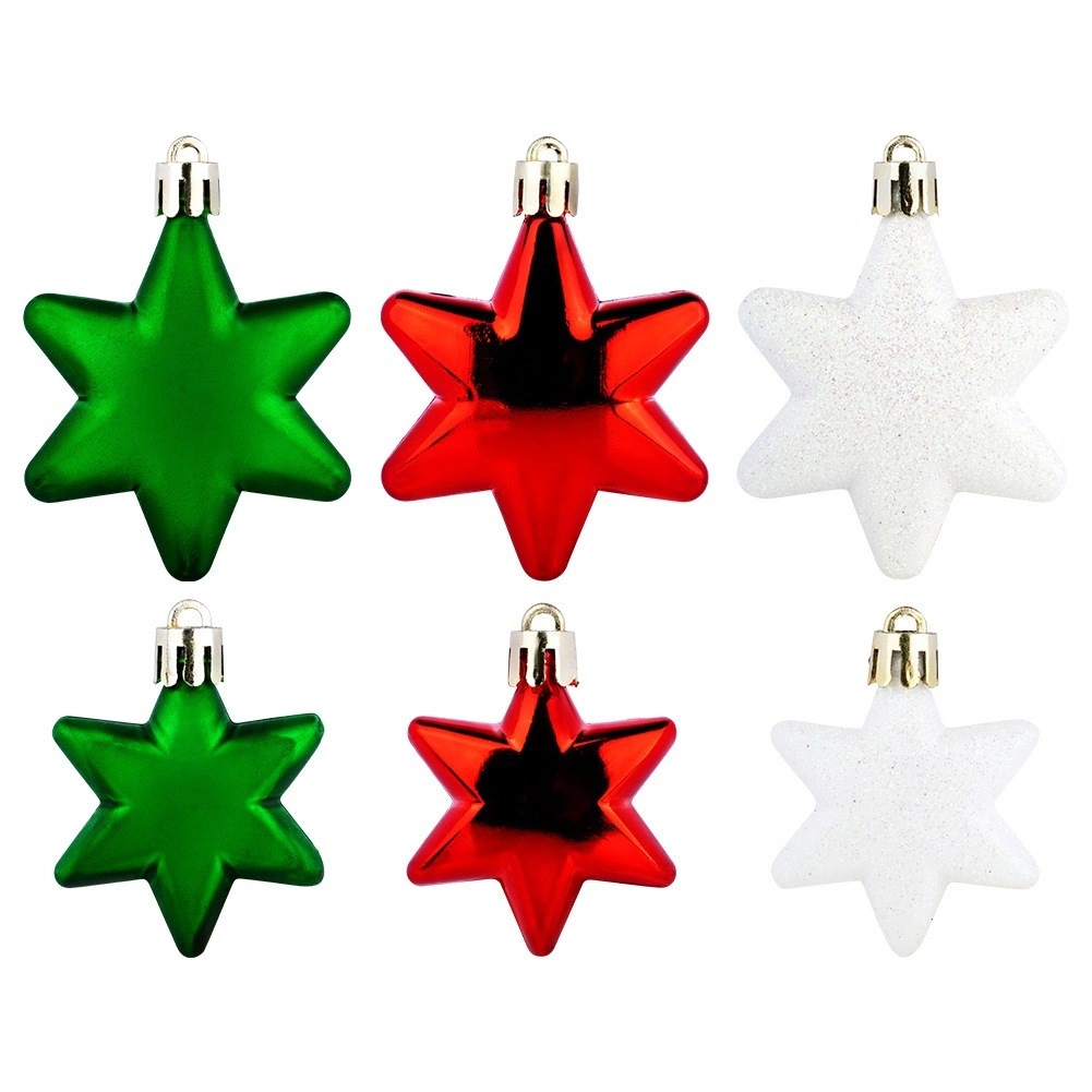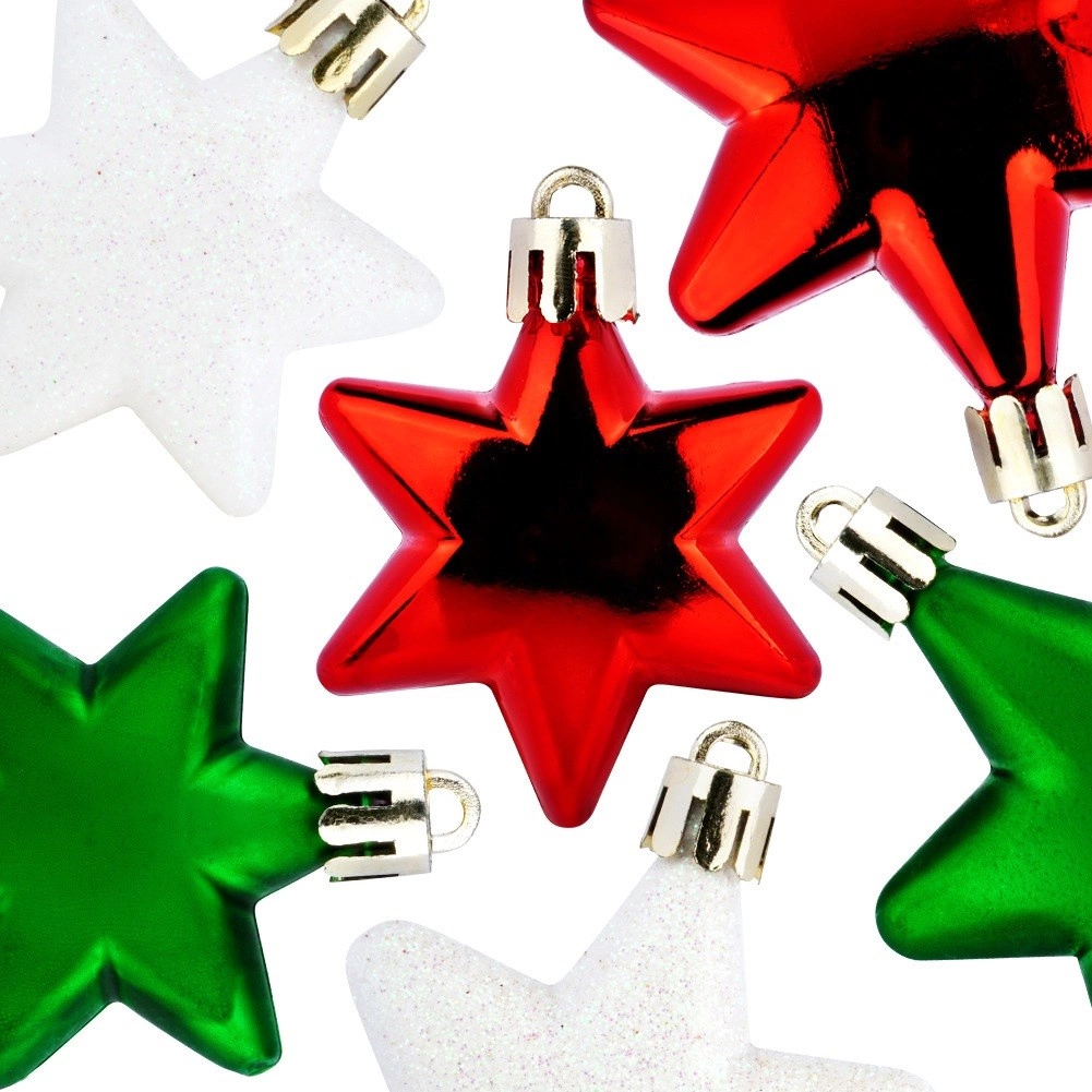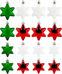 Lesklé, matné a trblietavé hviezdy v červenej, zelenej a bielej vytvoria harmonickú, slávnostnú kompozíciu a dodajú stromčeku klasický vianočný šarm.