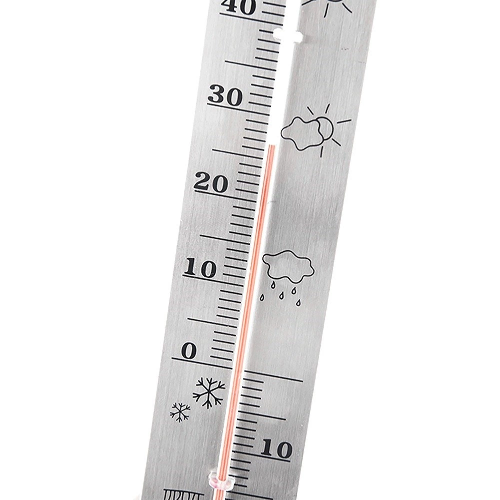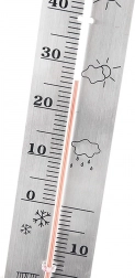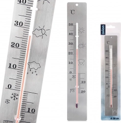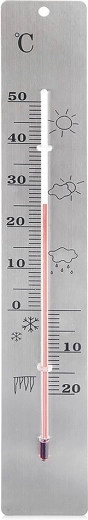 Klasický analógový teplomer na meranie teploty doma aj vonku s rozsahom -20 °C až 50 °C. Vyrobený z nehrdzavejúcej ocele v elegantnej striebornej farbe, bez ortuti (naftová náplň). Vďaka čitateľnej stupnici a možnosti zavesenia na stenu sa hodí na balkón, terasu, do záhrady aj interiéru. Rozmery 4,5 × 28 cm.