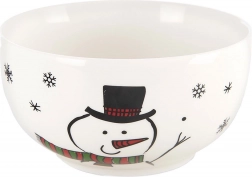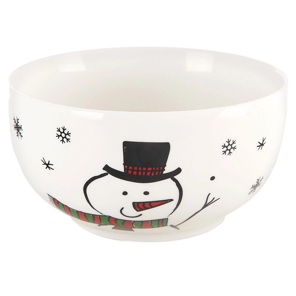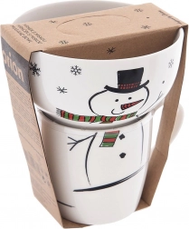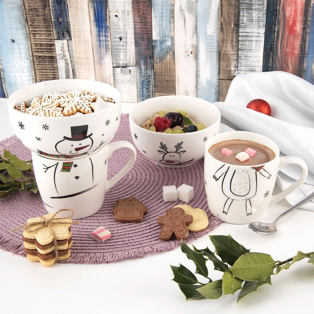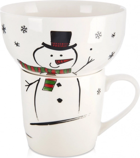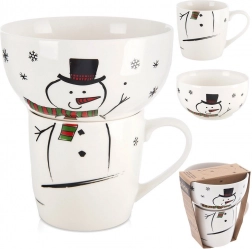 Hrnček a miska spolu vytvárajú podmanivý motív snehuliaka so šálom a snehovými vločkami – ideálne pre zimnú atmosféru a detskú radosť pri stole.