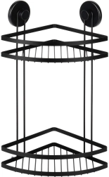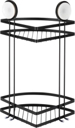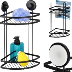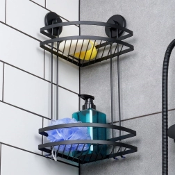 Praktická rohová sprchová polička s dvoma úrovňami a montážou na prísavky udrží vašu kozmetiku vždy poruke. Odolná kovová konštrukcia v matnej čiernej, bez vŕtania, ľahká inštalácia a nosnosť až 3,5 kg z nej robia ideálne riešenie na organizáciu kúpeľne.