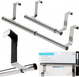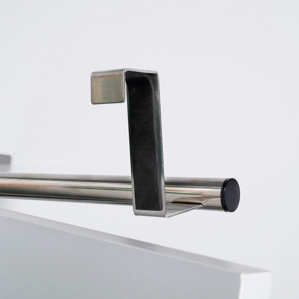 Praktický dverový vešiak z nehrdzavejúcej ocele s nastaviteľnou dĺžkou 25–40 cm pre skrinky a zásuvky. Bez vŕtania, stačí zavesiť na hranu dvierok do hrúbky 2 cm. Ideálny do kuchyne aj kúpeľne na uteráky a utierky, s ochrannými plstenými podložkami proti poškriabaniu.
