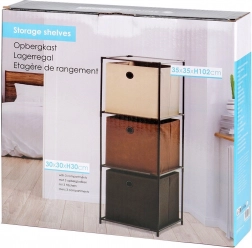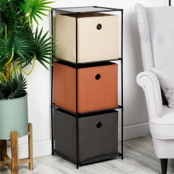 Tento úzky regál s rozmermi 34,5 × 34,5 × 100 cm kombinuje odolný čierny kovový rám a tri textilné boxy v farbách béžová, hnedá a antracit. Každý box má kovové očko na jednoduchú manipuláciu a je skladací, takže pri nepoužívaní nezaberá miesto. Ideálne riešenie na prehľadné triedenie a skladovanie.