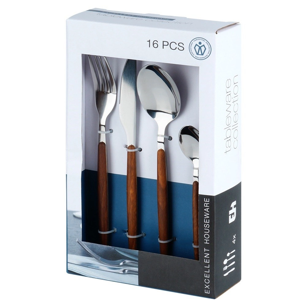 Kombinácia leštenej nehrdzavejúcej ocele a rukovätí s dekorom dreva prináša elegantný vzhľad a komfortný úchop na každodenné stolovanie.