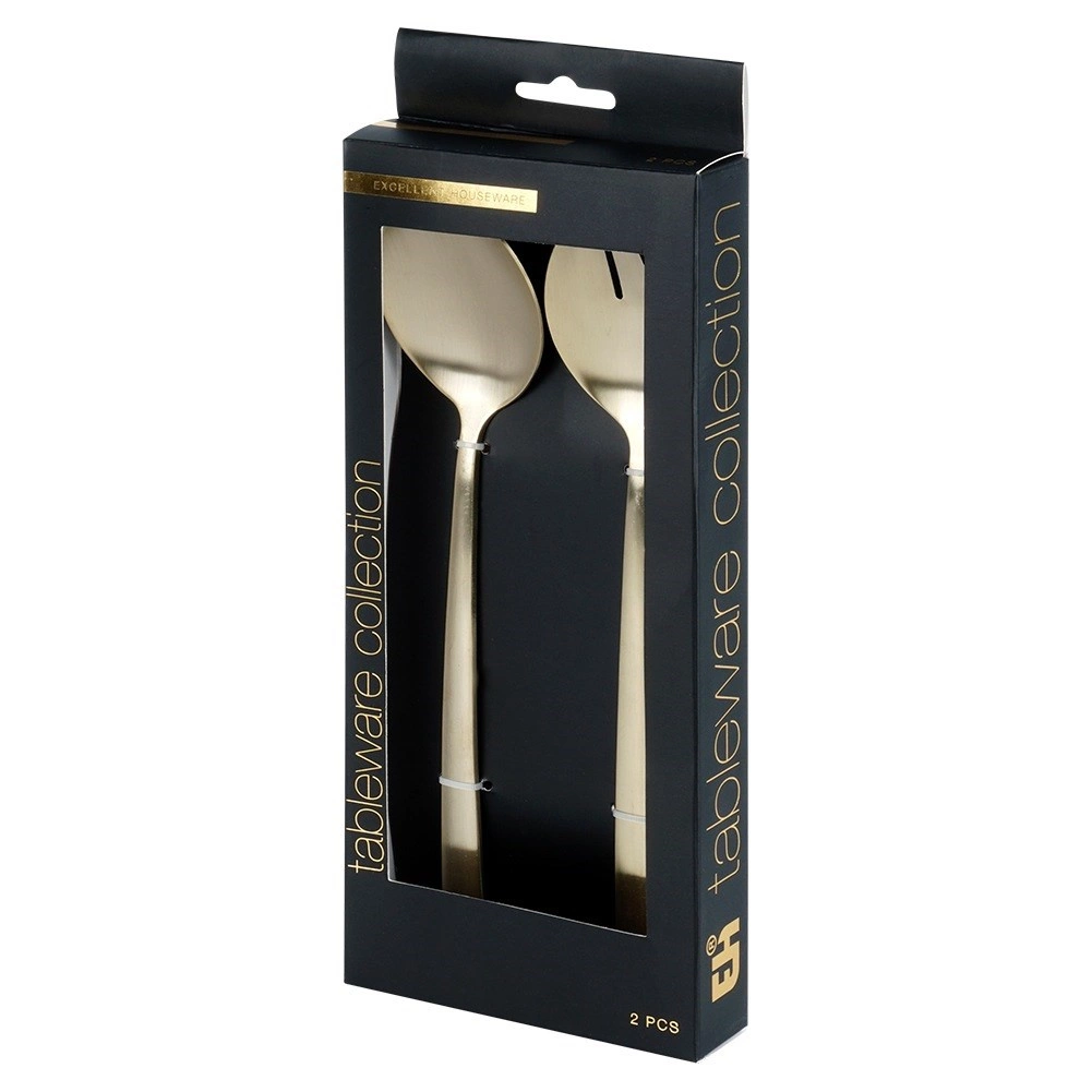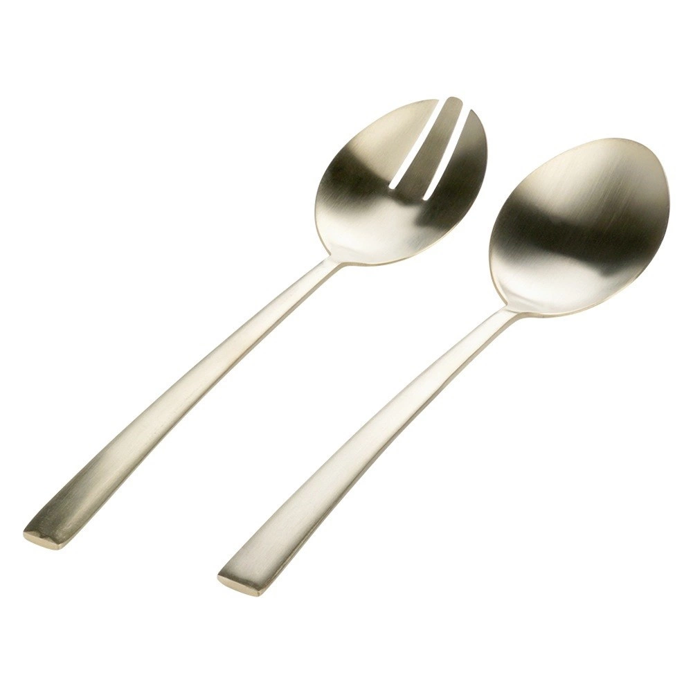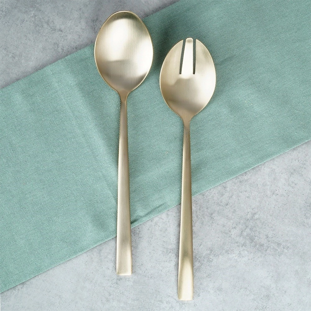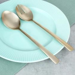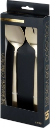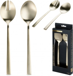 Sada 2 kusov štýlových šalátových lyžíc v obľúbenom zlatom prevedení dodá vášmu stolu nádych elegancie. Saténovo brúsený povrch kombinuje jemný lesk s decentným matom a vytvára moderný vzhľad vhodný do každého interiéru.