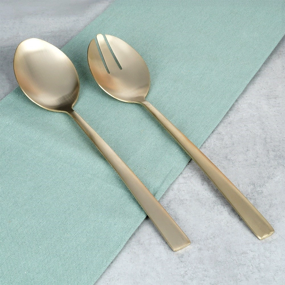 Elegantná sada dvoch servírovacích lyžíc na šalát s dĺžkou 25 cm v modernom zlatom odtieni so saténovým povrchom. Vyrobené z kvalitnej nehrdzavejúcej ocele, skvelé na miešanie aj servírovanie šalátov a ďalších jedál. Praktické, odolné a vhodné do umývačky riadu – ideálne na každodenné stolovanie aj slávnostné príležitosti.
