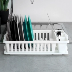 Udržte kuchyňu po umývaní riadu vždy v suchu a poriadku. Tento kompaktný odkvapkávač v klasickej bielej farbe pojme až 10 tanierov a vďaka oddeleným priehradkám bezpečne usuší aj príbory a drobné kuchynské náradie. Vyberateľná odkvapkávacia tácka zachytí prebytočnú vodu a zjednoduší čistenie.