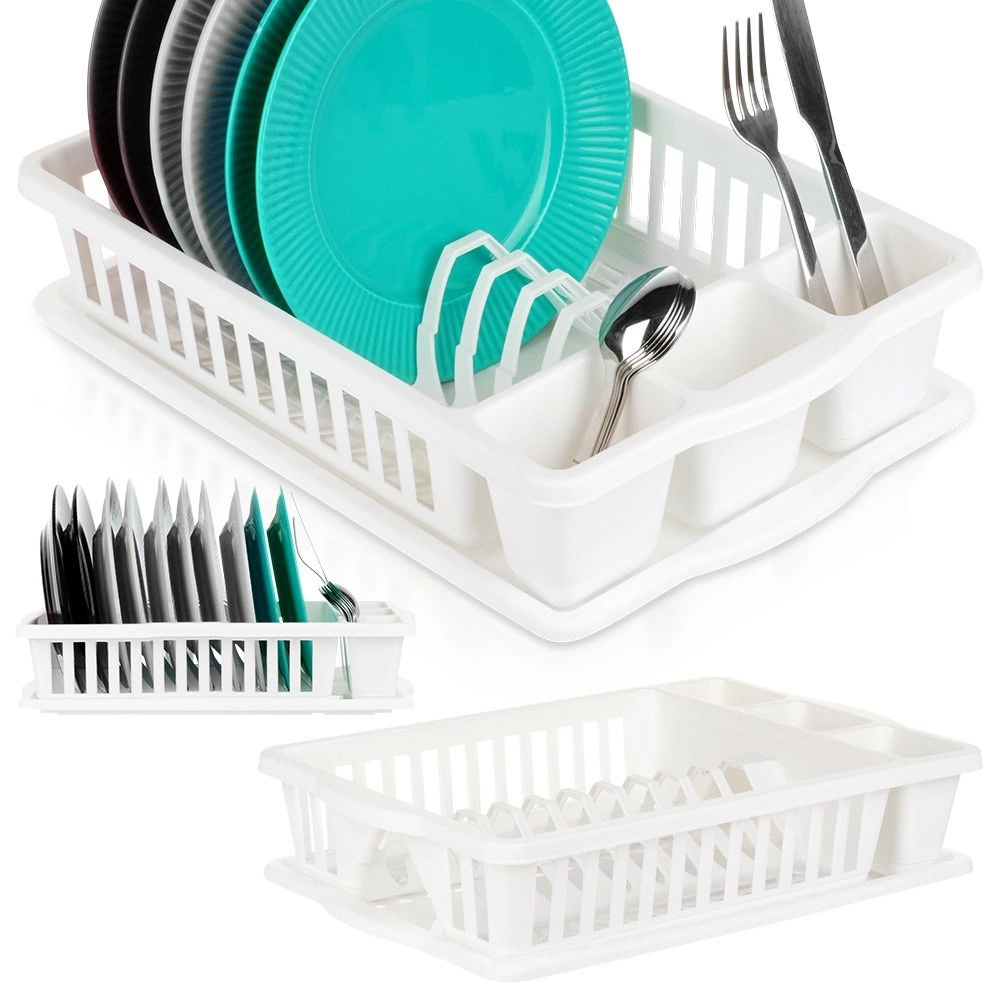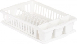 Praktický biely odkvapkávač na riad s rozmermi 39,5 × 26 × 8,5 cm na prehľadné sušenie tanierov, pohárov a príborov. Ponúka veľkú kapacitu, vyberateľný odkvapkávací tácku a odolné plastové prevedenie, ktoré chráni kuchynskú dosku pred vodou a uľahčuje údržbu.
