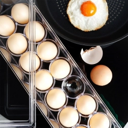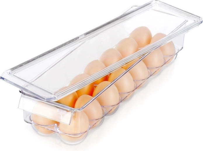 Tento odolný a opakovane použiteľný box na vajcia je navrhnutý na bezpečné a hygienické skladovanie až 14 vajec v chladničke. Priehľadné prevedenie zabezpečuje okamžitý prehľad o množstve, veko chráni obsah a umožňuje čisté a organizované prostredie v chladničke.
