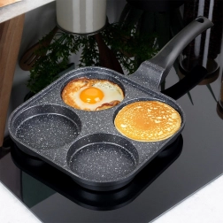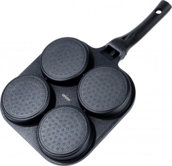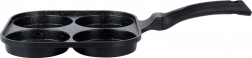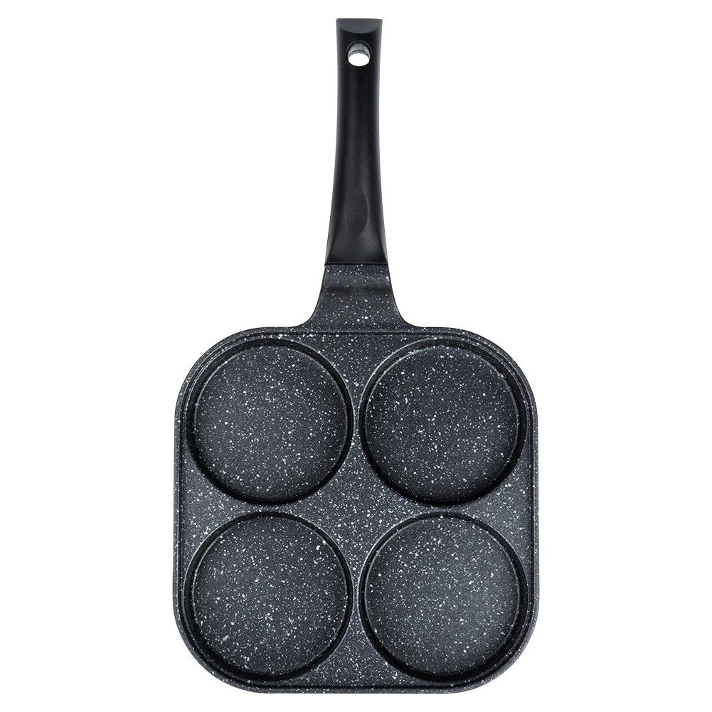 Štvorcová panvica 22 × 22 cm so štyrmi samostatnými komorami zabezpečí jednotnú veľkosť porcií a perfektný vzhľad raňajok. Hliníkové telo s granitovou nepriľnavou vrstvou sa rýchlo zohrieva a výborne rozvádza teplo, takže smažíte rýchlo, úsporne a bez pripálenia. Ergonomická, protišmyková rukoväť s otvorom na zavesenie zaručuje pohodlné a bezpečné používanie.