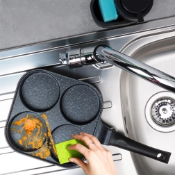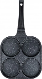 Praktická granitová panvica so štyrmi okrúhlymi formami s priemerom 10 cm na dokonale tvarované volské oká, lievance a mini palacinky. Vďaka nepriľnavému povrchu PFLUON GRANIT pripravíte jedlá s minimom tuku, rýchlo a rovnomerne. Vhodná na plyn, elektrinu, keramiku, halogén aj indukciu, ľahko sa čistí a možno ju umývať v umývačke.