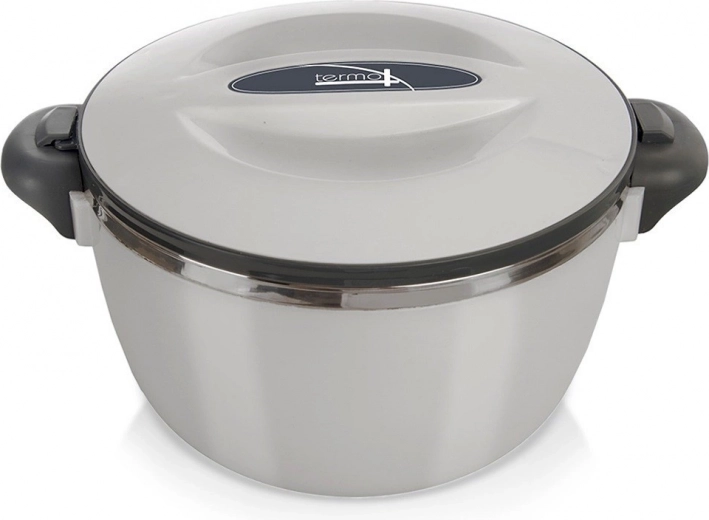 Praktická oceľová termomisa s objemom 2 l udrží vaše jedlo dlho teplé alebo studené. Má nerezovú vnútornú misu, odolný plastový plášť v sivej perleťovej farbe a bezpečné bočné úchyty na jednoduché prenášanie. Ideálna do práce, školy aj na výlety. Upozornenie: nie je 100 % tesniaca, preto prenášajte vo zvislej polohe.
