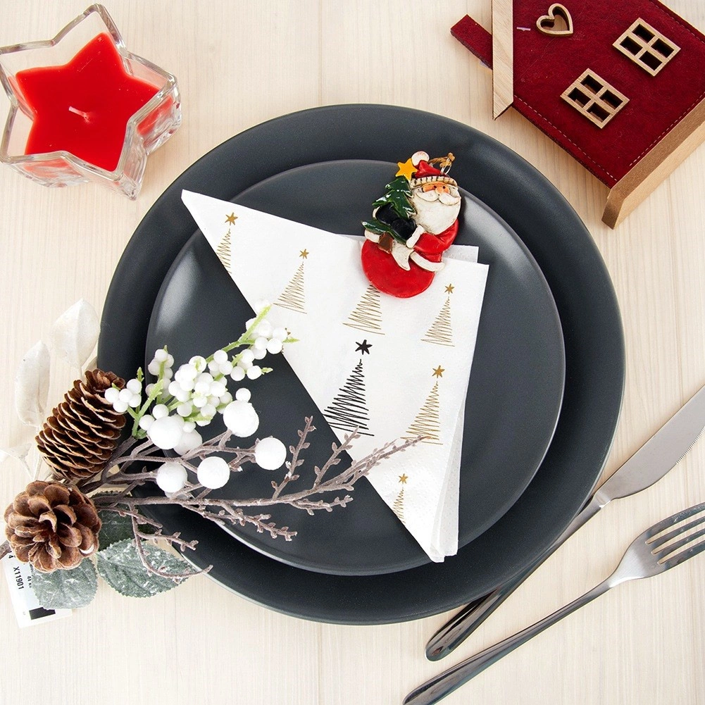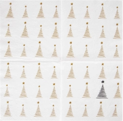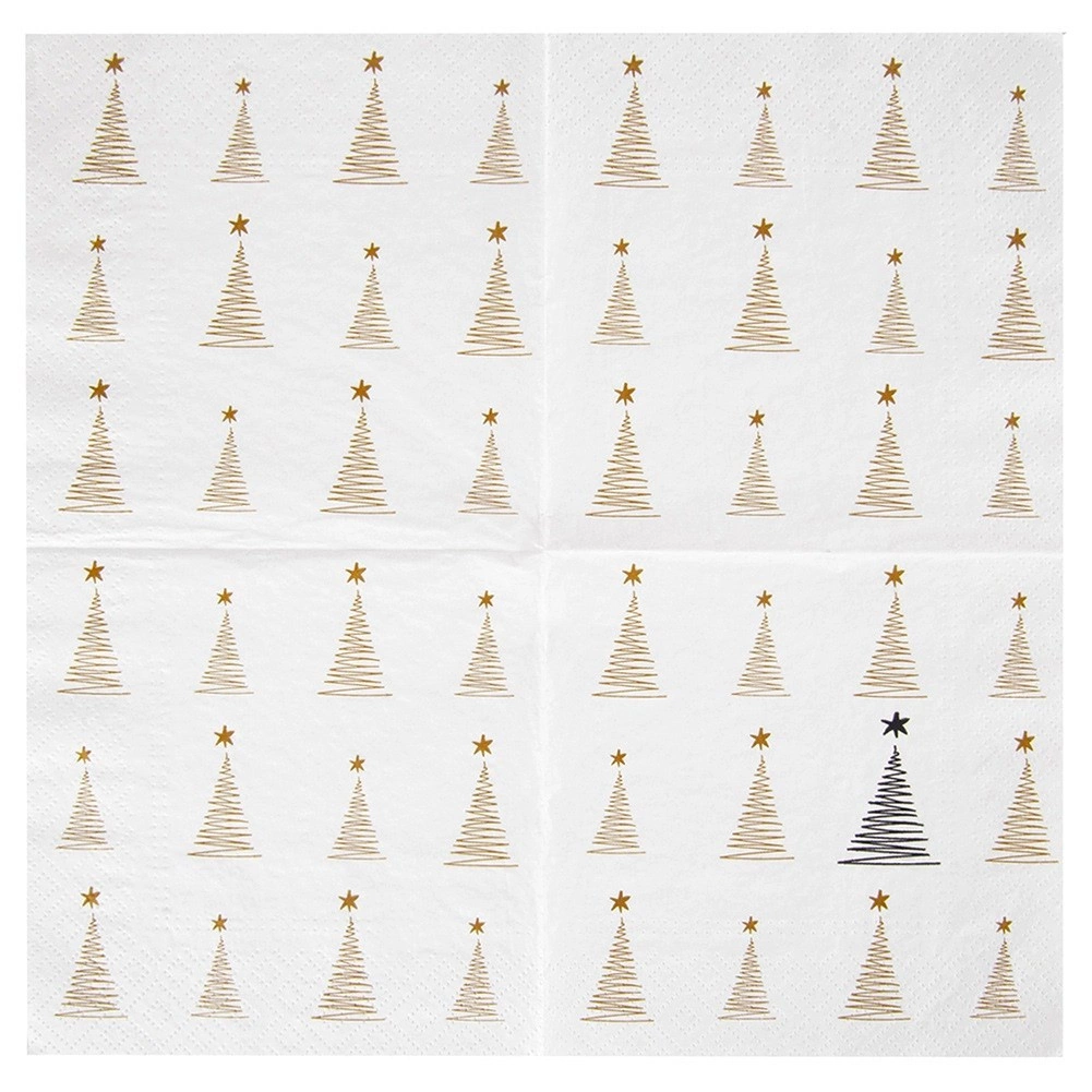 Doprajte svojmu stolu sviatočnú atmosféru s papierovými servítkami v bielej farbe so zlatým motívom stromčekov. Vďaka 3-vrstvovej štruktúre sú príjemné na dotyk, pevné a spoľahlivo sajú tekutiny. Po rozložení majú rozmer 33 × 33 cm (pred rozložením 16,5 × 16,5 cm), takže poslúžia pri hlavnom chode aj pri deserte.