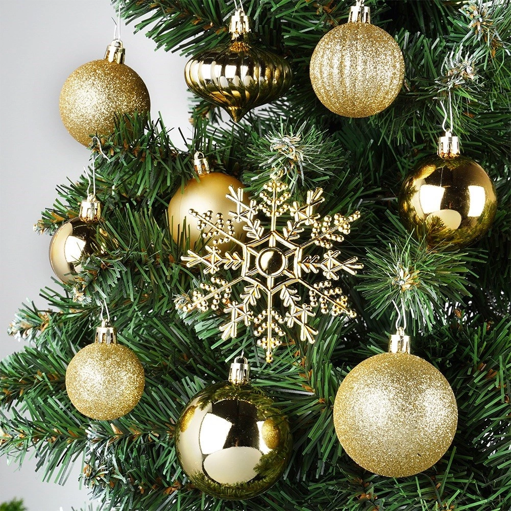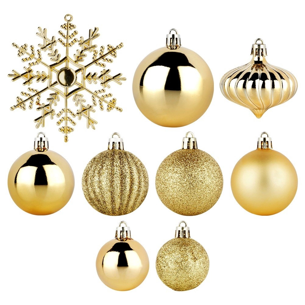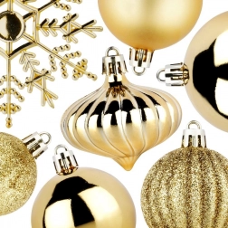 Lesklé, matné, trblietavé aj reliéfne gule v zjednotenej zlatej farbe vytvárajú harmonickú, no vizuálne bohatú výzdobu.