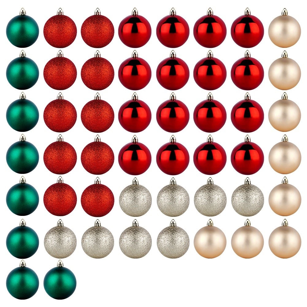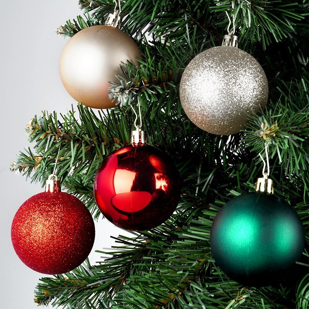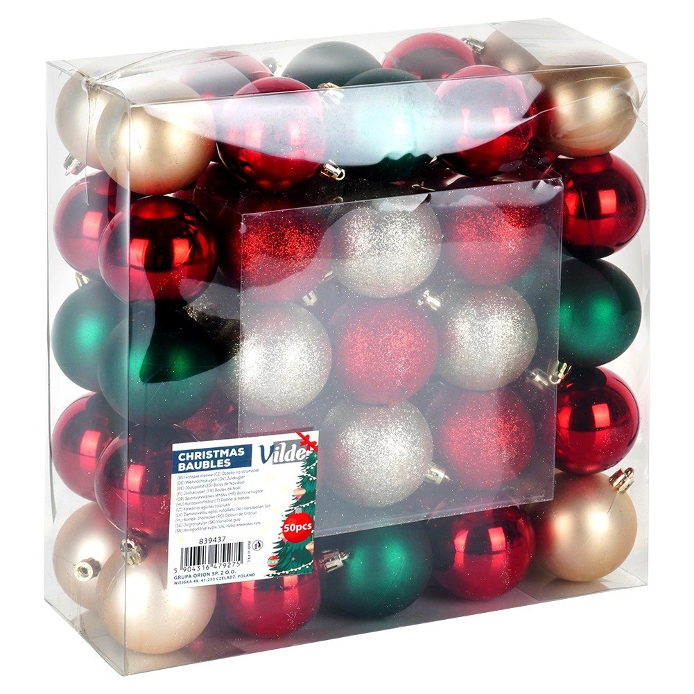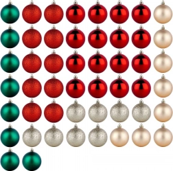 Štýlová sada 50 nerozbitných vianočných gulí s priemerom 6 cm v farbách červená, zelená a šampanská v lesklom, matnom a trblietavom prevedení. Odolné plastové ozdoby s kovovými čiapočkami a šnúrkami na zavesenie dodajú stromčeku klasický lesk a vytvoria čarovnú sviatočnú atmosféru – bezpečná voľba do domácností s deťmi aj domácimi miláčikmi.