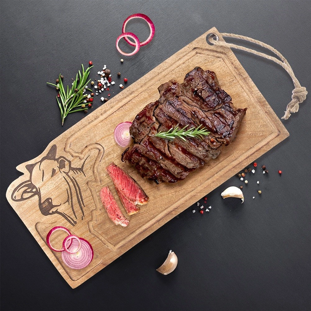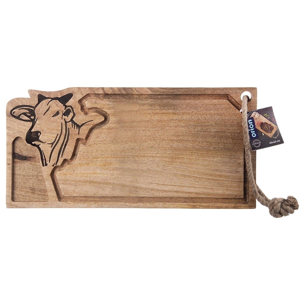 Objavte všestrannú drevenú dosku z mangového dreva, ktorá vyniká pevnosťou, prirodzenou odolnosťou a krásnou kresbou. Vďaka praktickému žliabku na šťavy udrží doska kuchynskú linku v čistote pri krájaní mäsa, ovocia aj zeleniny. Rytá hlava býka a závesné lanko podčiarkujú jej dekoratívnu aj funkčnú hodnotu.
