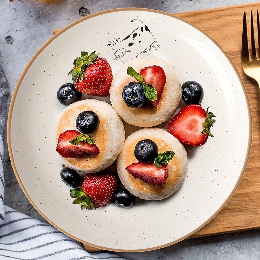 Štýlový dezertný tanier s priemerom 20 cm z kvalitnej keramiky v béžovej farbe s jemným škvrnitím a prírodným kameninovým okrajom. Skvele sa hodí na podávanie dezertov, snackov aj raňajok. Vďaka odolnému materiálu je vhodný do umývačky aj mikrovlnnej rúry. Efektný dizajn s reliéfnym motívom kravičky oživí každý stôl a perfektne ladí s rôznymi druhmi stolového riadu.