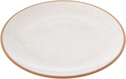 Elegantný keramický tanier s priemerom 27 cm v príjemnom béžovom odtieni s jemným škvrnitým dekorom a kamenným lemom. Skvele sa hodí na každodenné stolovanie aj slávnostné príležitosti. Je odolný, ľahko sa čistí a je vhodný do umývačky aj mikrovlnnej rúry. Vďaka univerzálnemu využitiu poslúži na obedy, večere, dezerty aj servírovanie pochutín.