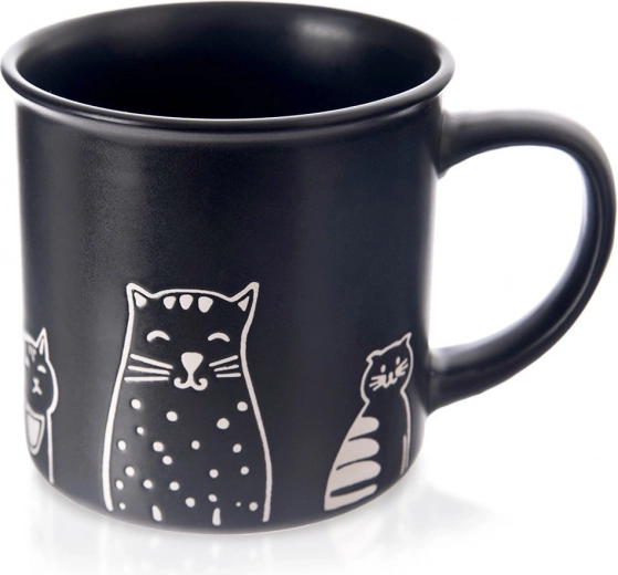 Štýlový keramický hrnček s objemom 500 ml v matnej čiernej farbe s hravými motívmi mačiek je ideálny na kávu, čaj aj kakao. Má pohodlné ucho, je vhodný do umývačky aj mikrovlnky a vďaka kvalitnej keramike vydrží každodenné používanie.