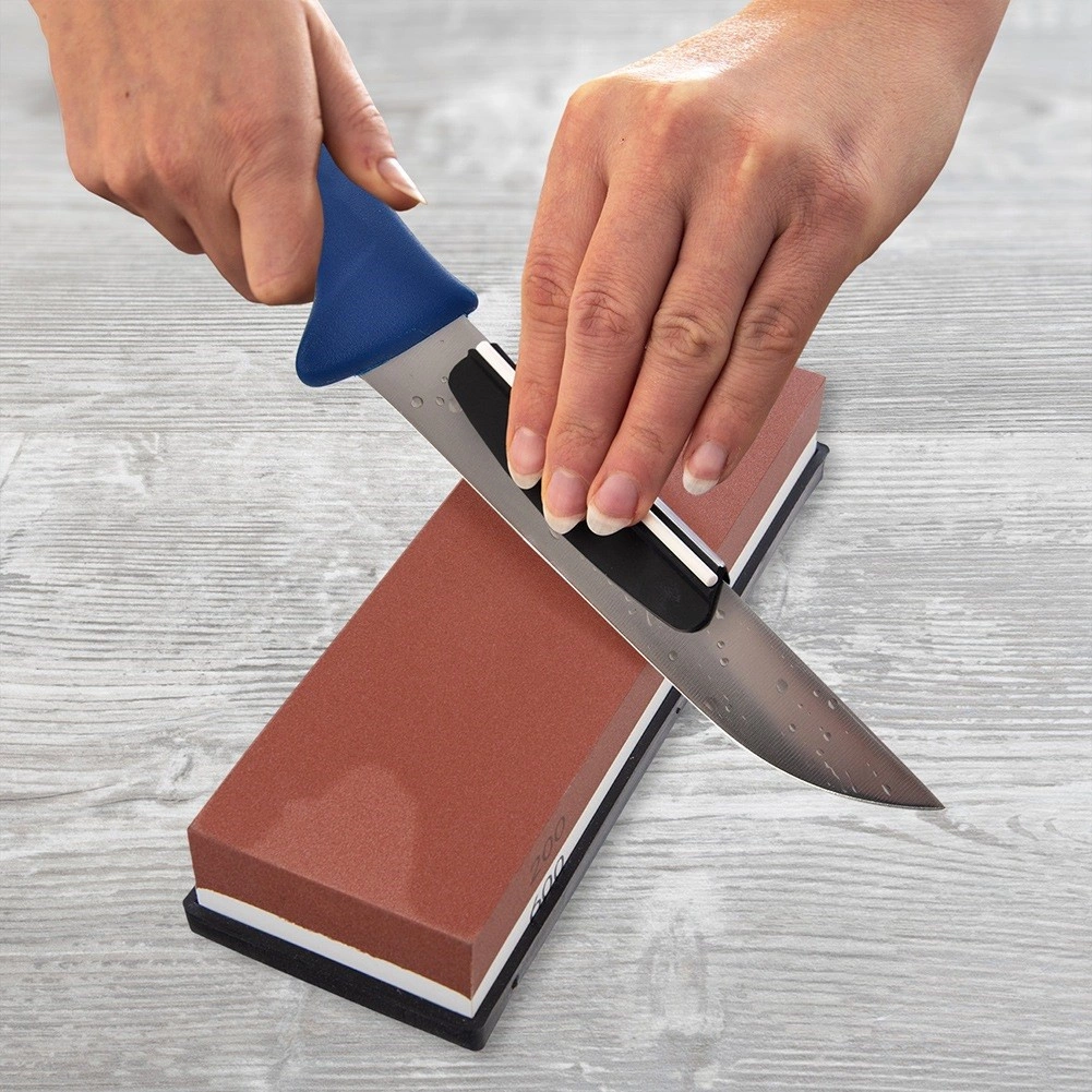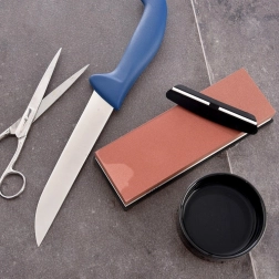 Protišmyková silikónová podložka drží kameň pevne na mieste, takže sa pri brúsení nehýbe. Kameň je určený na mokrý spôsob brúsenia – stačí ho pred použitím namočiť na cca 10 minút a počas brúsenia priebežne zvlhčovať. Po práci nechajte prirodzene vyschnúť. Nevhodné pre zúbkované a keramické nože.