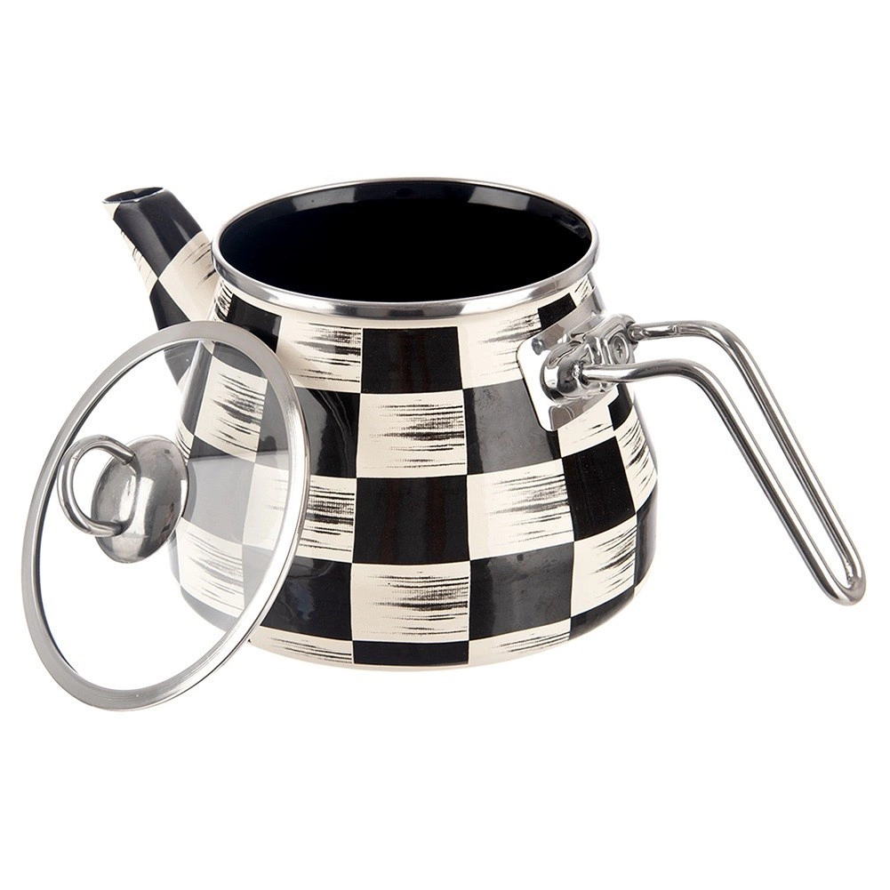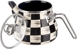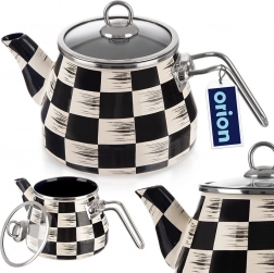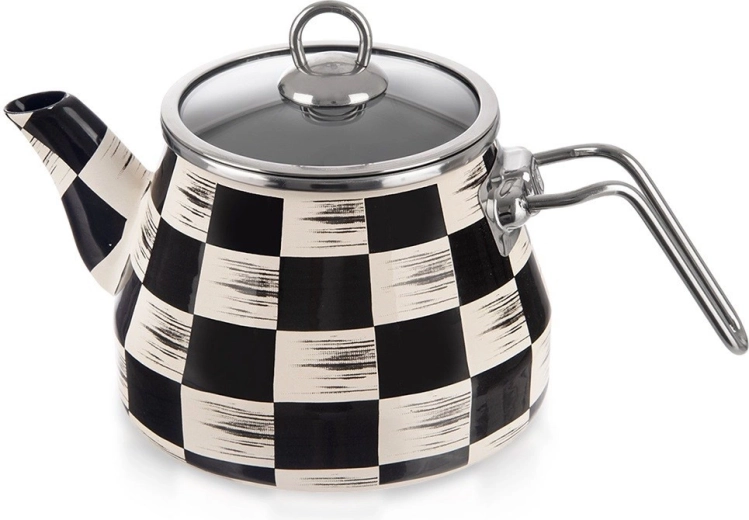 Štýlová smaltovaná kanvica s objemom 2 l (užitočný 1,5 l) v elegantnom vzore šachovnice. Ponúka rýchly ohrev vody, odolné smaltované prevedenie, sklenenú pokrievku na kontrolu varu a kompatibilitu so všetkými typmi sporákov vrátane indukcie. Možno umývať v umývačke a vďaka kovovej rukoväti sa ľahko nalieva.