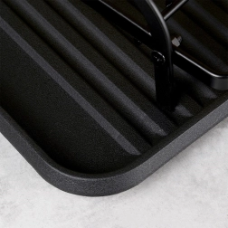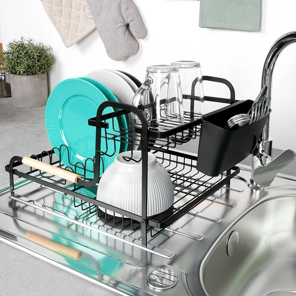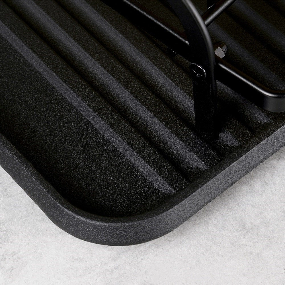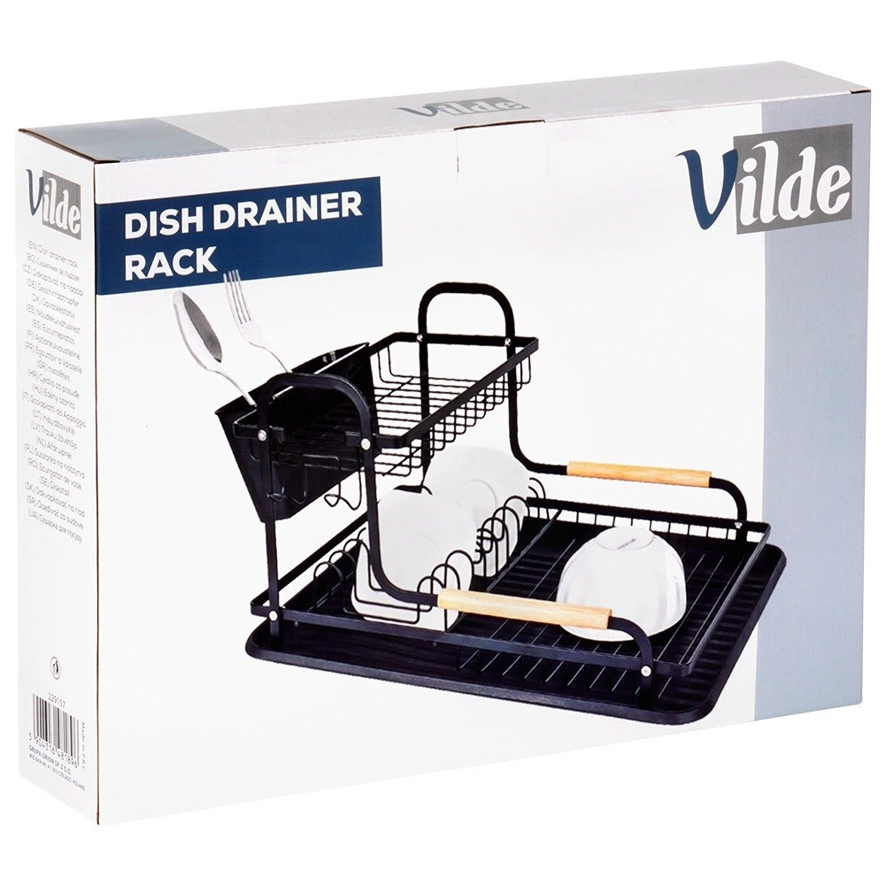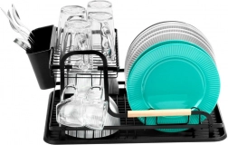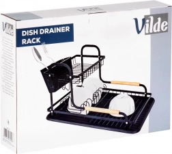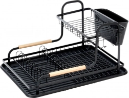 Robustný rám z odolného kovu v čiernej matnej úprave dopĺňajú elegantné drevené rukoväte pre jednoduché prenášanie. Vyberateľný dvojkomorový košík na príbory pomáha udržať poriadok a urýchľuje schnutie. Odkvapkávač sa ľahko čistí a je navrhnutý pre každodenné pohodlie.