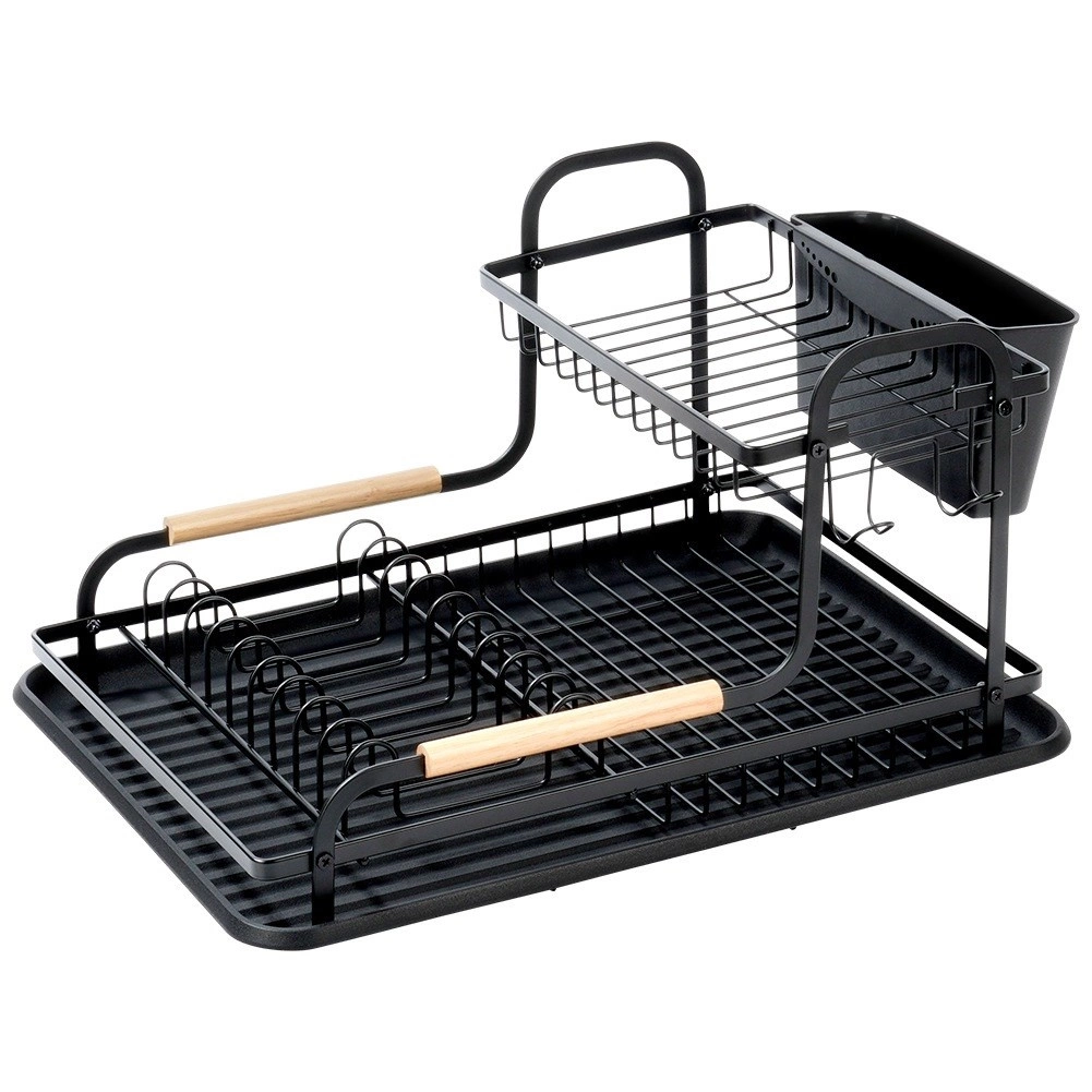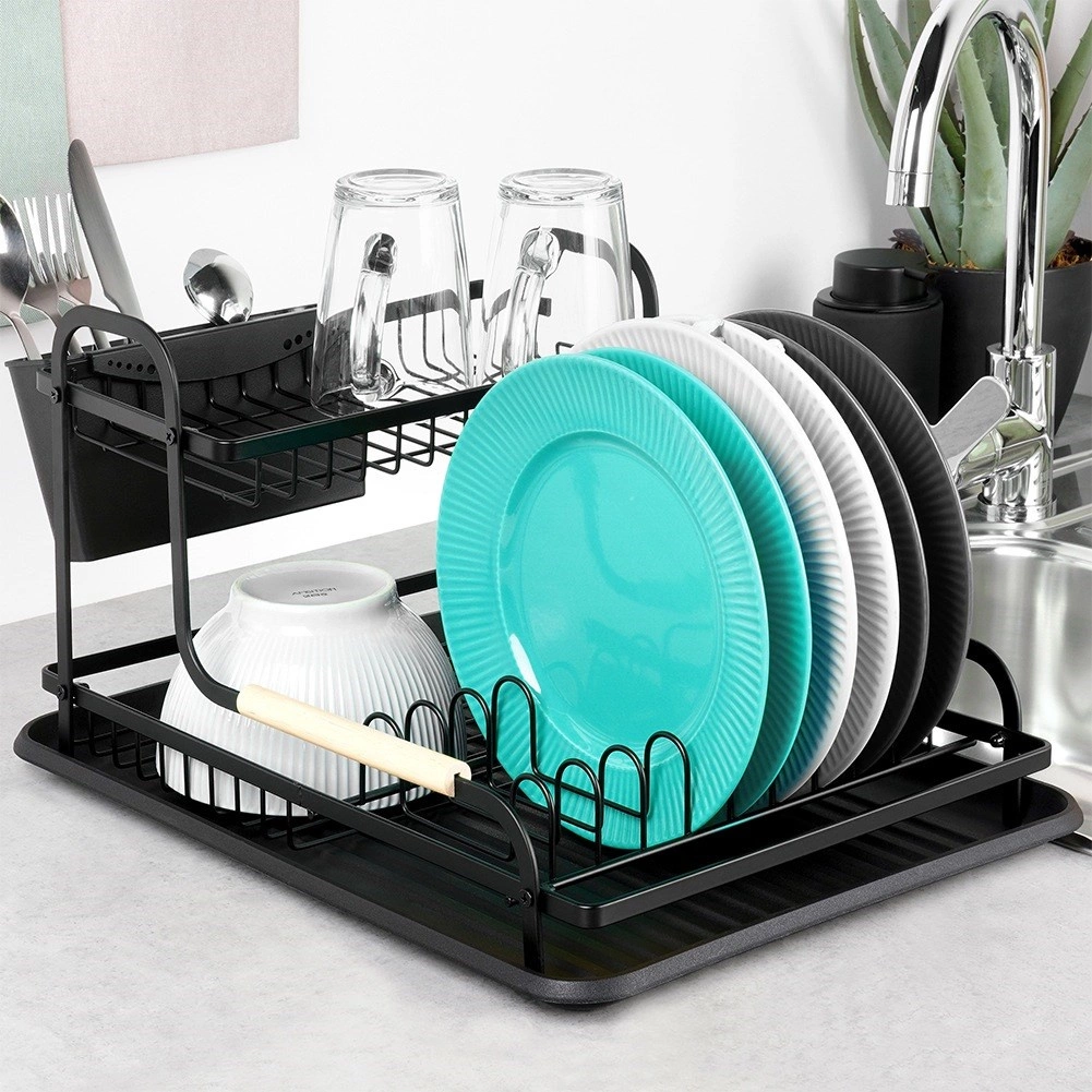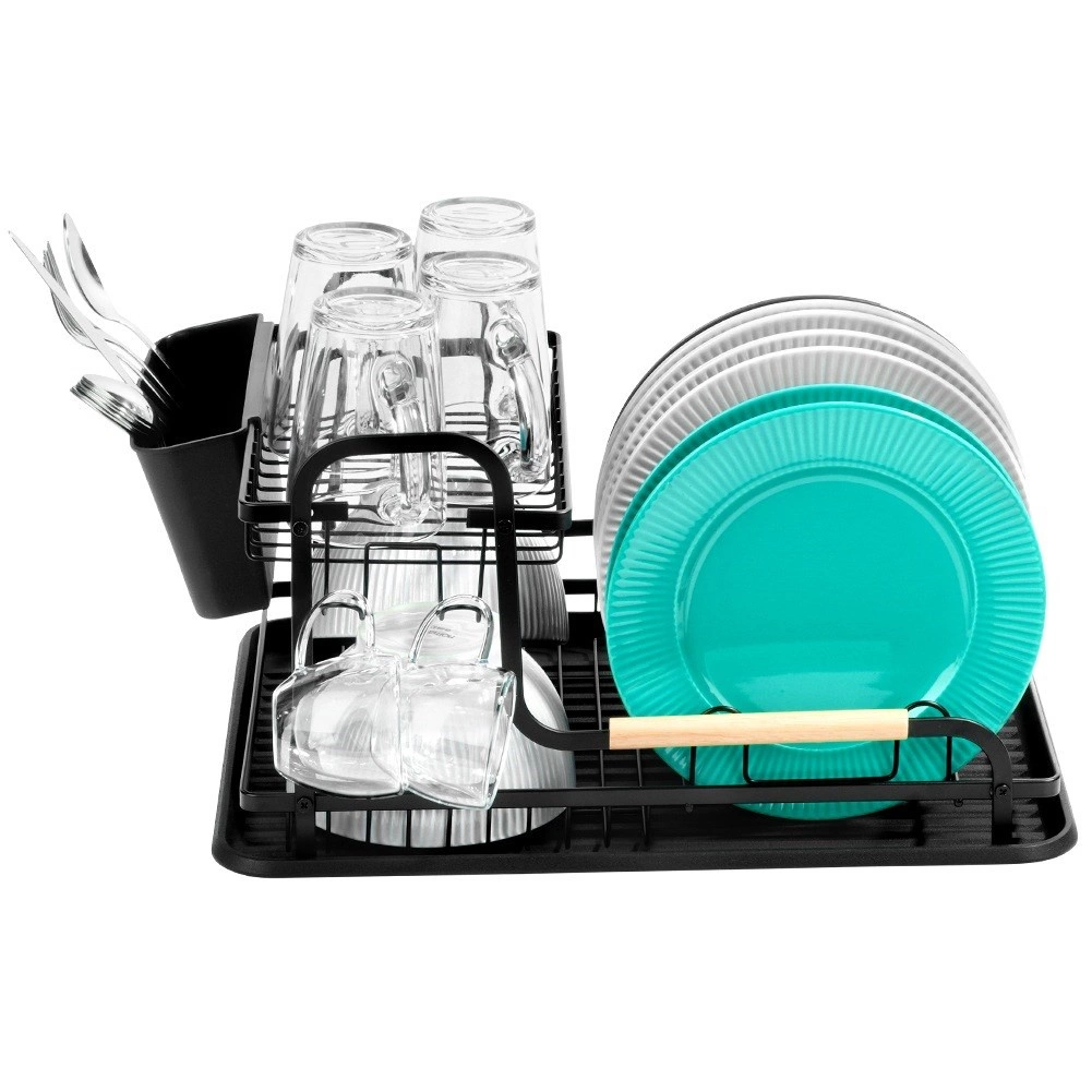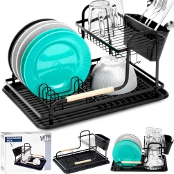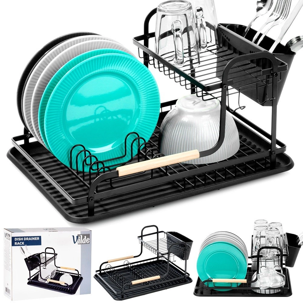 Štýlový dvojposchodový odkvapkávač na riad s rozmermi 48,5 × 32 × 23,5 cm efektívne organizuje taniere, poháre aj príbory a chráni pracovnú dosku pred vodou. Kombinuje pevnú kovovú konštrukciu v čiernej matnej farbe s drevenými akcentmi, má praktickú odkvapkávaciu misku a vyberateľný dvojkomorový košík na príbory. Vďaka dvom úrovniam ponúka veľkú kapacitu a rýchlejšie sušenie riadu v každej modernej aj klasickej kuchyni.