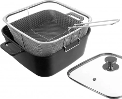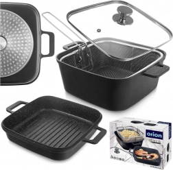 Tento praktický set kombinuje štvorcový hlboký hrniec s pokrievkou (4,5 l), grilovaciu panvicu (2 l) a nerezový košík. Vďaka nepriľnavému granitovému povrchu PFLUON odolnému proti poškrabaniu pripravíte jedlá s minimom tuku a s perfektným výsledkom. Priehľadná sklenená pokrievka s parným ventilčekom uľahčí kontrolu a urýchli varenie.