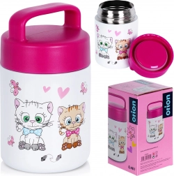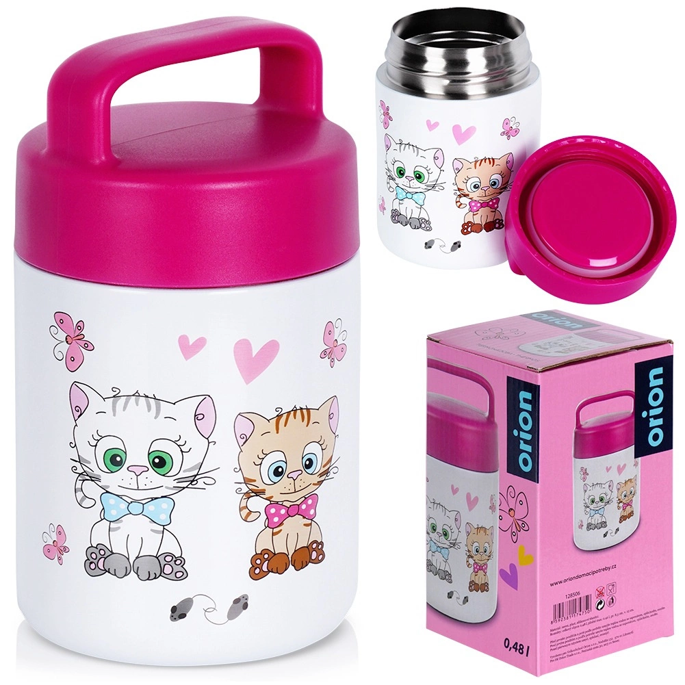 Štýlový detský termohrnček na jedlo s motívom mačiatok zaujme vzhľadom a poteší funkčnosťou. Vďaka širokému hrdlu sa ľahko plní polievkami, kašami, šalátmi aj ovocnými desiatami a rovnako pohodlné je aj čistenie. Nerezová oceľ zaistí odolnosť a hygienu, zatiaľ čo viečko s tesnením spoľahlivo bráni pretekaniu.