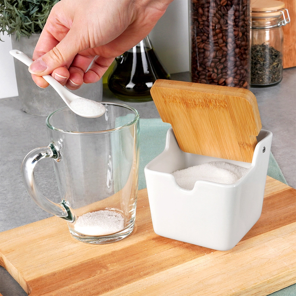 Táto kompaktná cukornička (9,5 × 9,5 × 9 cm) je vyrobená z odolnej bielej keramiky a doplnená bambusovým vyklápacím viečkom, ktoré chráni obsah pred vlhkosťou a prachom. Súčasťou je ladiaca keramická lyžička (13 cm) s šikovným miestom na uloženie, takže je vždy po ruke.