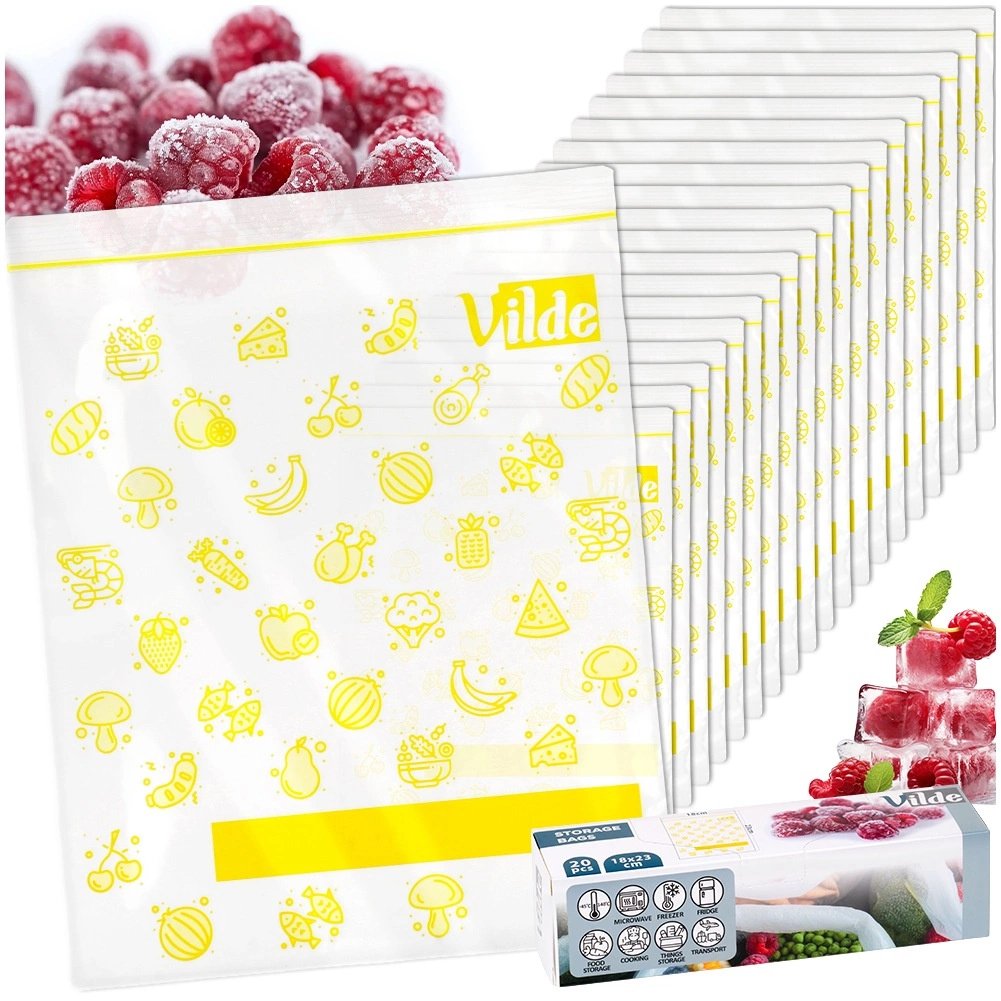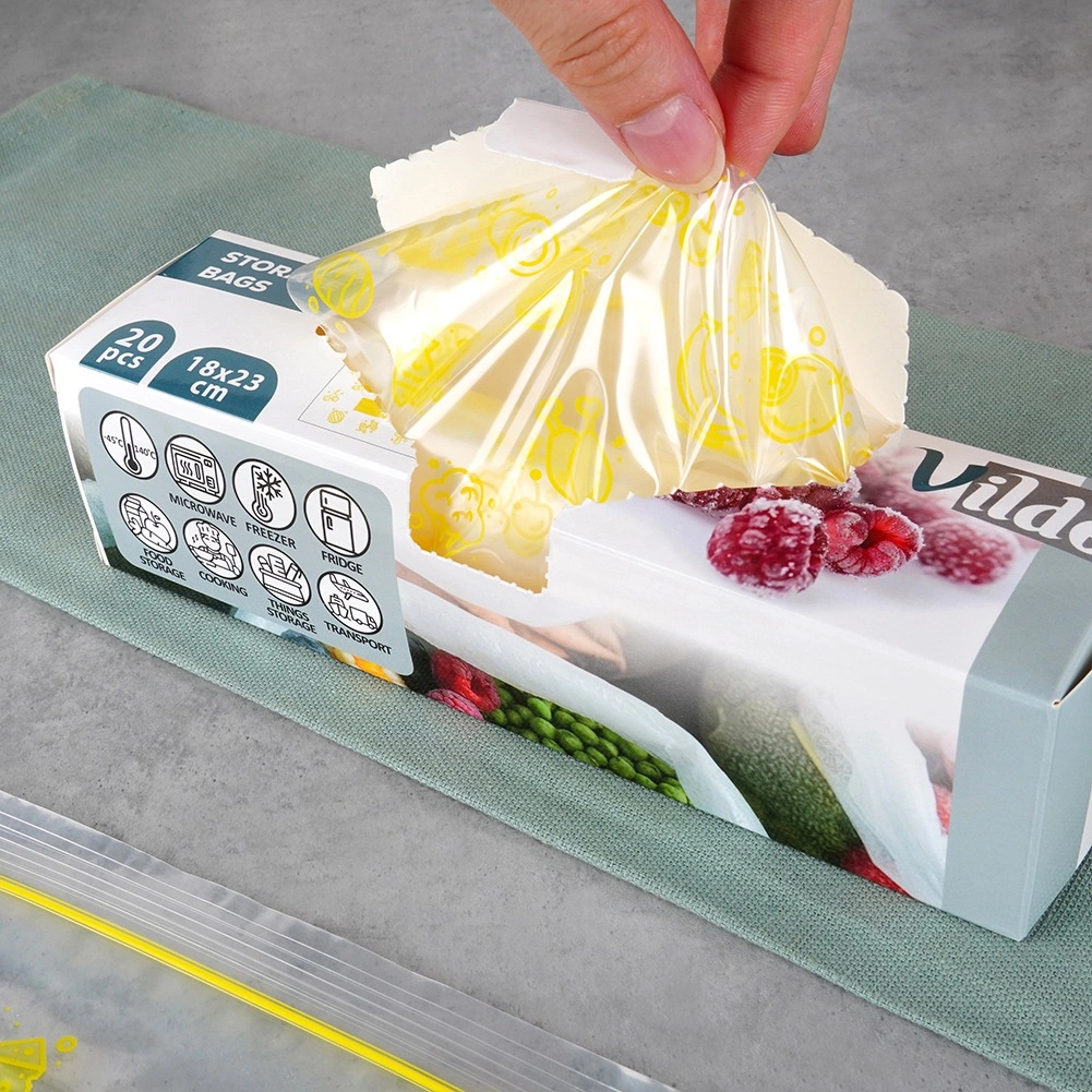 Praktická sada 20 kusov priehľadných vreciek so zipsovým uzáverom na každodenné uchovávanie potravín. Vzduchotesné uzavretie chráni pred vlhkosťou a stratou čerstvosti, univerzálne použitie na ovocie, zeleninu, mäso či desiaty. Vhodné do mrazničky aj mikrovlnky (−45 °C až 140 °C). Špeciálne pole na popis obsahu uľahčí organizáciu.
