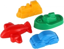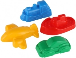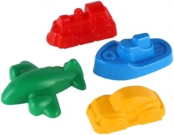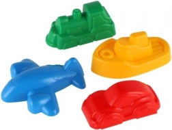 Vlak, loď, lietadlo a auto v jasných farbách motivujú deti k tvoreniu a hre v piesku aj pri vode.