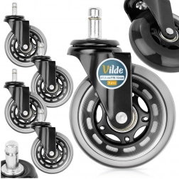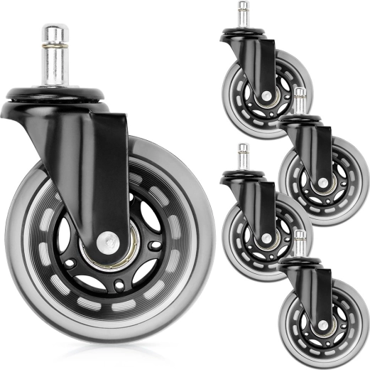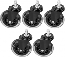 Vylepšite svoje kancelárske kreslo tichými a odolnými kolieskami z kaučuku s priemerom 75 mm a čapom 10 mm. Sada 5 ks zabezpečuje plynulý a tichý pohyb, ochranu podlahy pred škrabancami a rýchlu montáž bez náradia. Kompatibilné s mnohými kancelárskymi kreslami vrátane vybraných modelov IKEA s rovnakým rozmerom uchytenia.