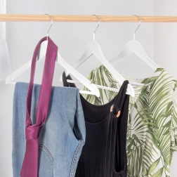 Zárezy na ramienka pre šaty a topy, priečka pre nohavice či doplnky – jedno ramienko zvládne viac typov odevov.