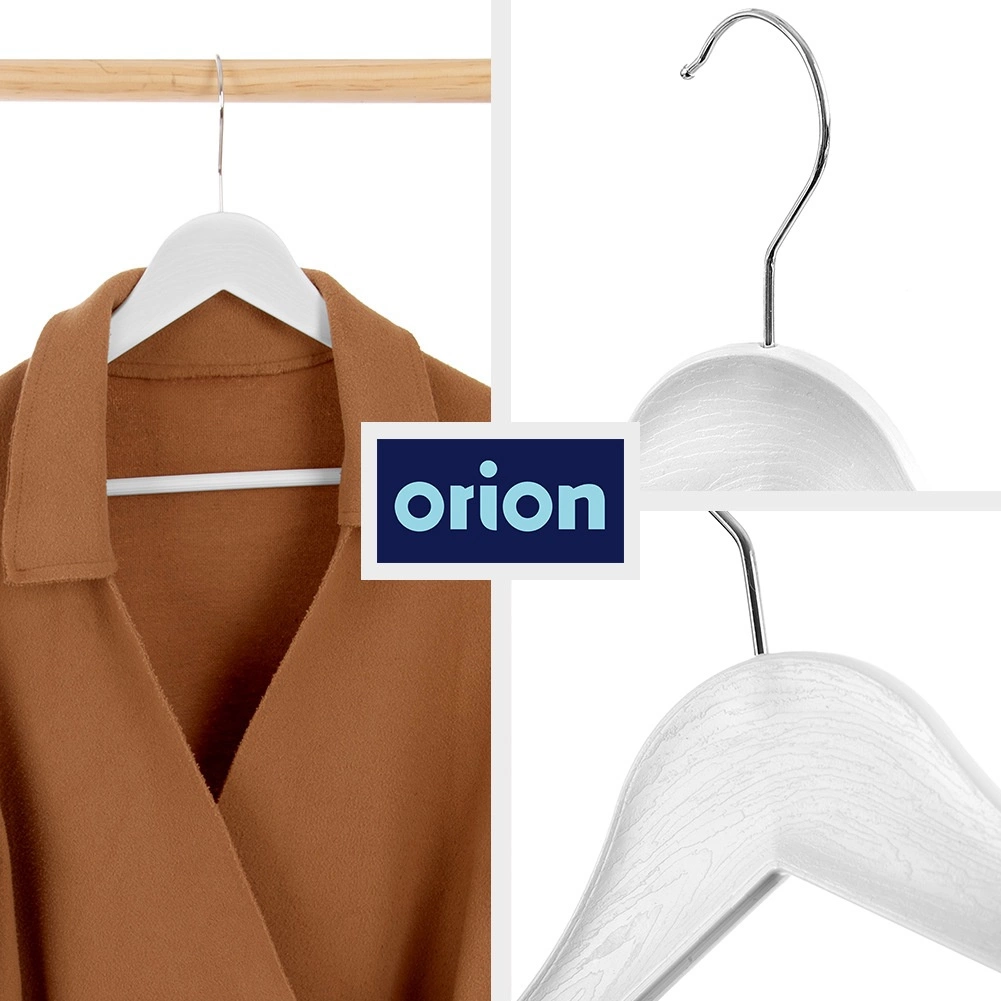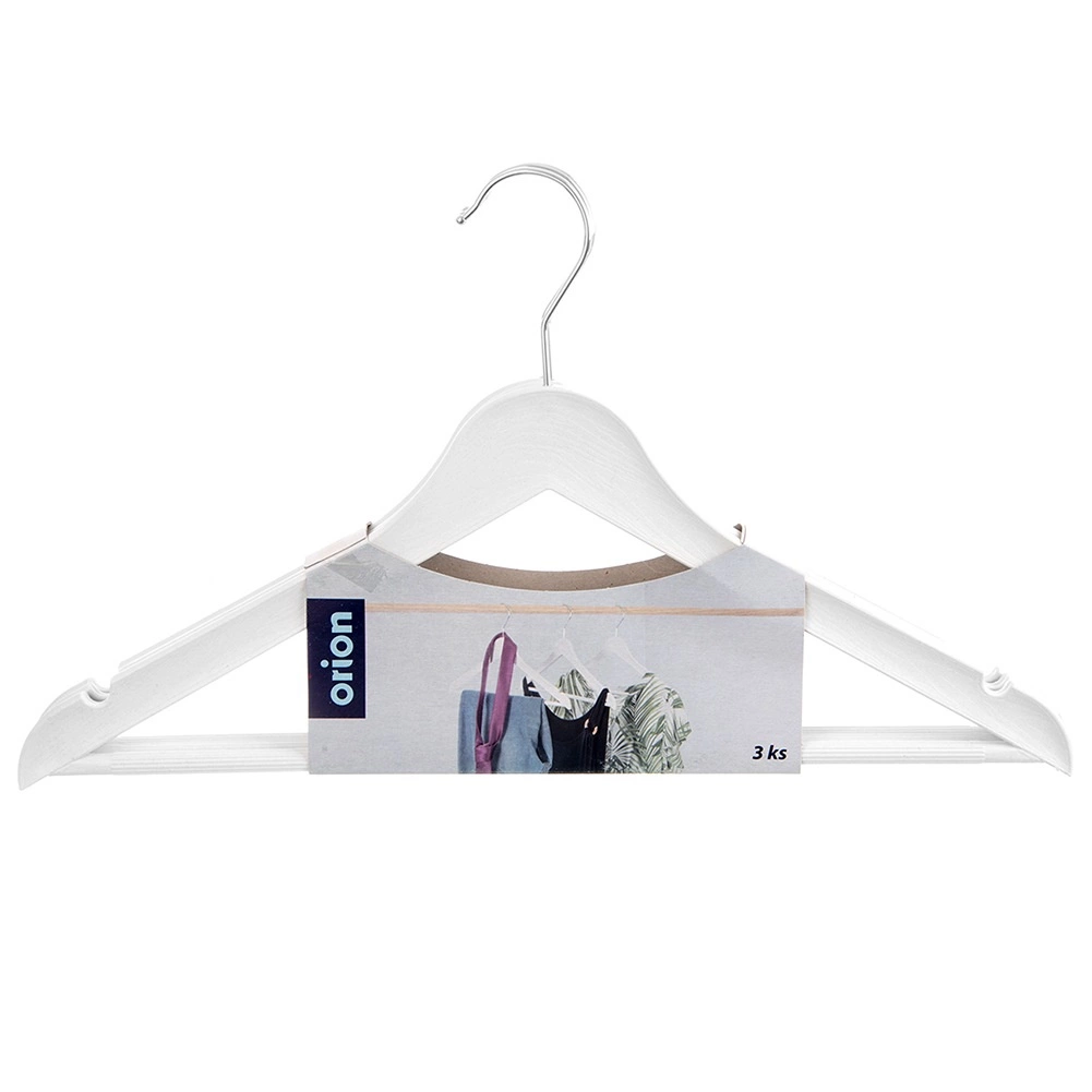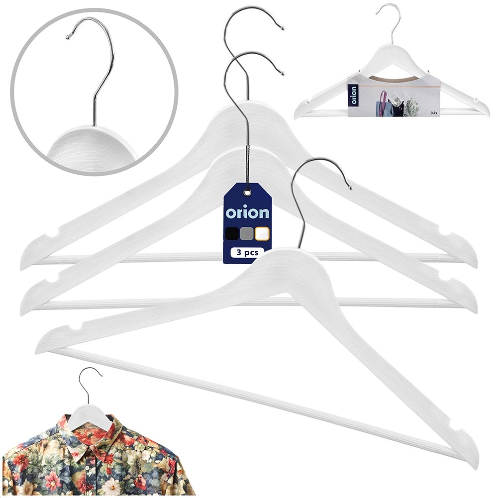 Praktická sada 3 bielych ramienok s otočným háčikom pre prehľadnú organizáciu skrine. Vzhľad imitujúci drevo a kovový háčik dodávajú eleganciu, ramienka sú univerzálne pre košele, šaty aj kabáty. Každé ramienko má rozmery 42,5 × 24 × 1 cm a vďaka otočnému háčiku je ich umiestnenie v skrini maximálne pohodlné. Originálny produkt českej značky ORION.