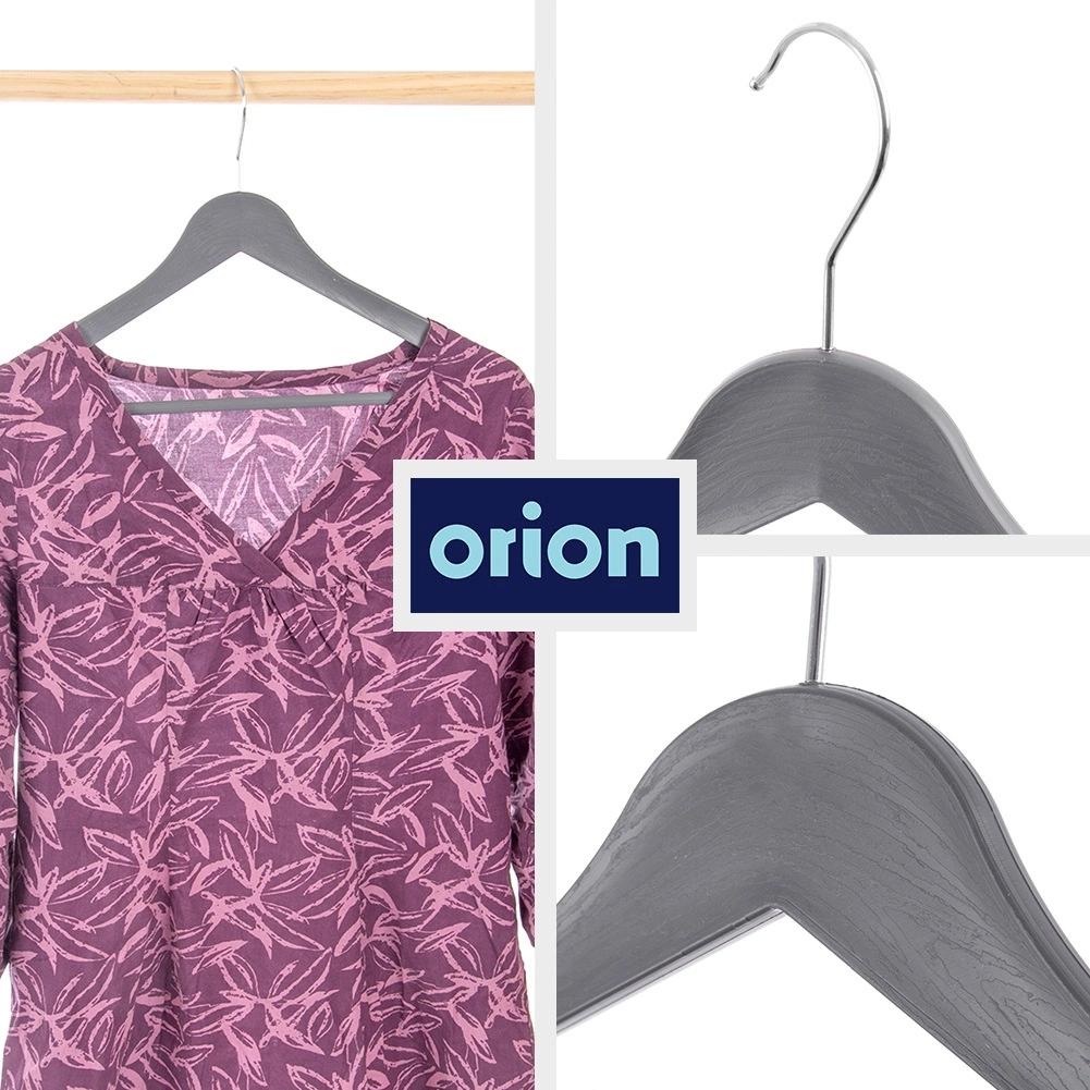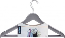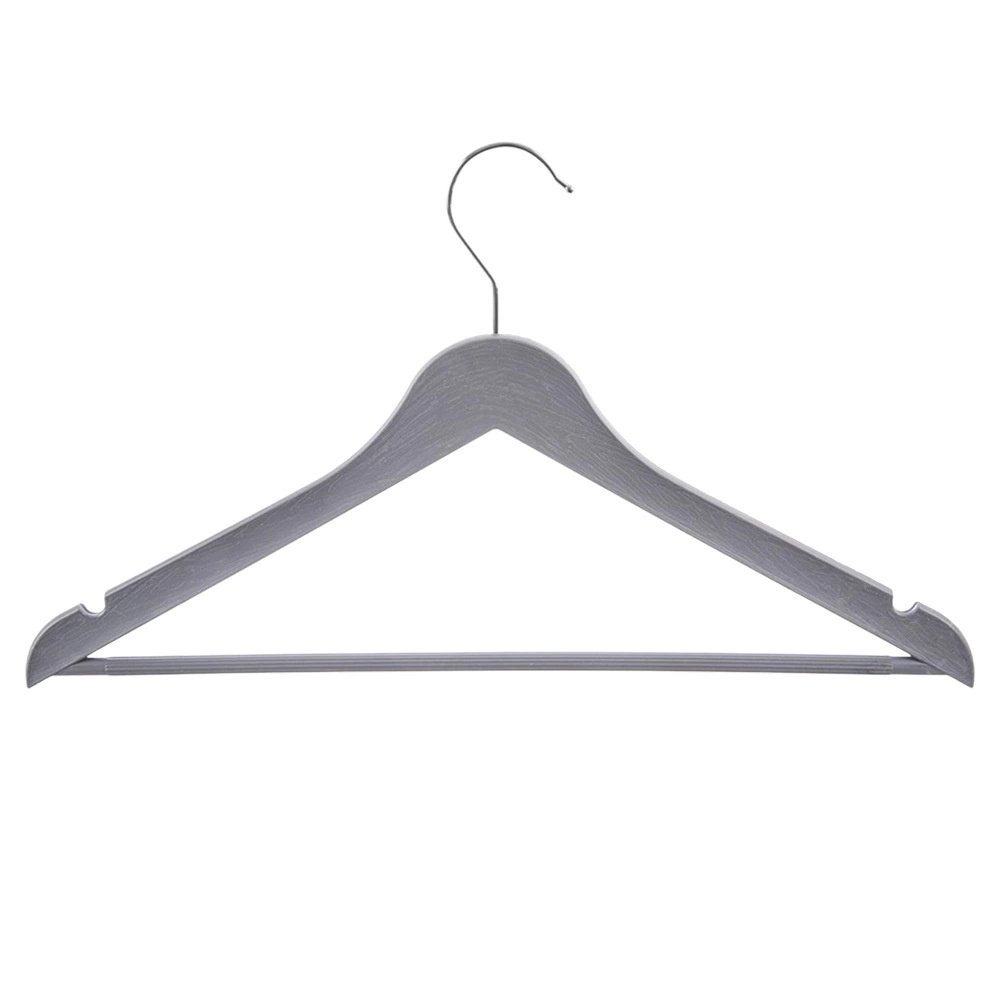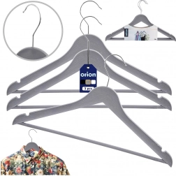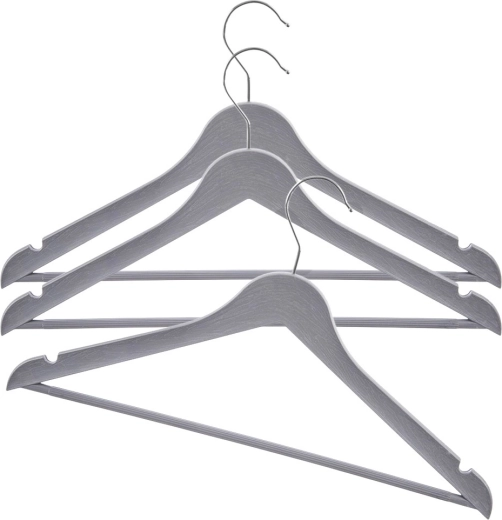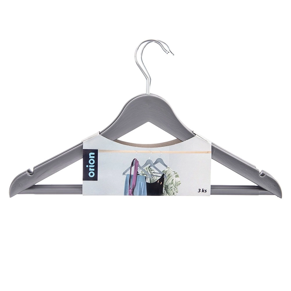 Praktická sada troch sivých vešiakov s otočným háčikom na prehľadné uloženie odevov v šatníku aj v predajni. Vešiaky majú univerzálne využitie, protišmykové zárezy na ramenách a vodorovnú tyč na nohavice či šatky. Vďaka odolnému prevedeniu a elegantnému vzhľadu imitujúcemu drevo udržia košele, blúzky aj ťažšie kabáty vždy na svojom mieste.