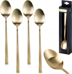 Štýlová sada štyroch dlhých koktejlových lyžičiek z nehrdzavejúcej ocele v zlatom saténovom prevedení. Ideálne na latte, koktaily, dezerty a nápoje vo vysokých pohároch. Lyžičky majú rozmery 3 × 18 cm, sú bezpečné pre styk s potravinami a vhodné do umývačky riadu.