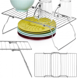 Praktická a stabilná kuchynská polica so skladacími nožičkami pomôže lepšie využiť vertikálny priestor v skrinkách aj na pracovnej doske. Vďaka rozmerom 37 × 21 × 13,5 cm a výške po zložení len 3,5 cm ponúka úsporu miesta, pevná kovová konštrukcia a rýchle usporiadanie riadu, hrnčekov či potravín. V univerzálnej sivej farbe sa hodí do kuchyne, špajze, kúpeľne aj kancelárie.