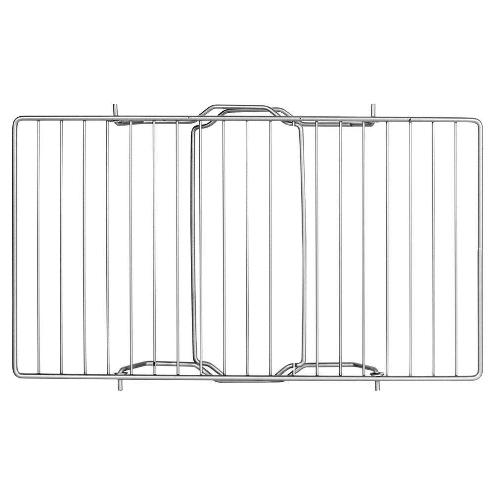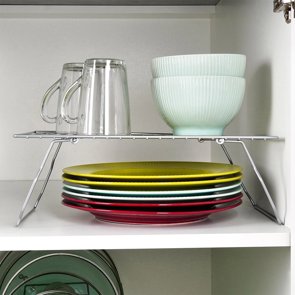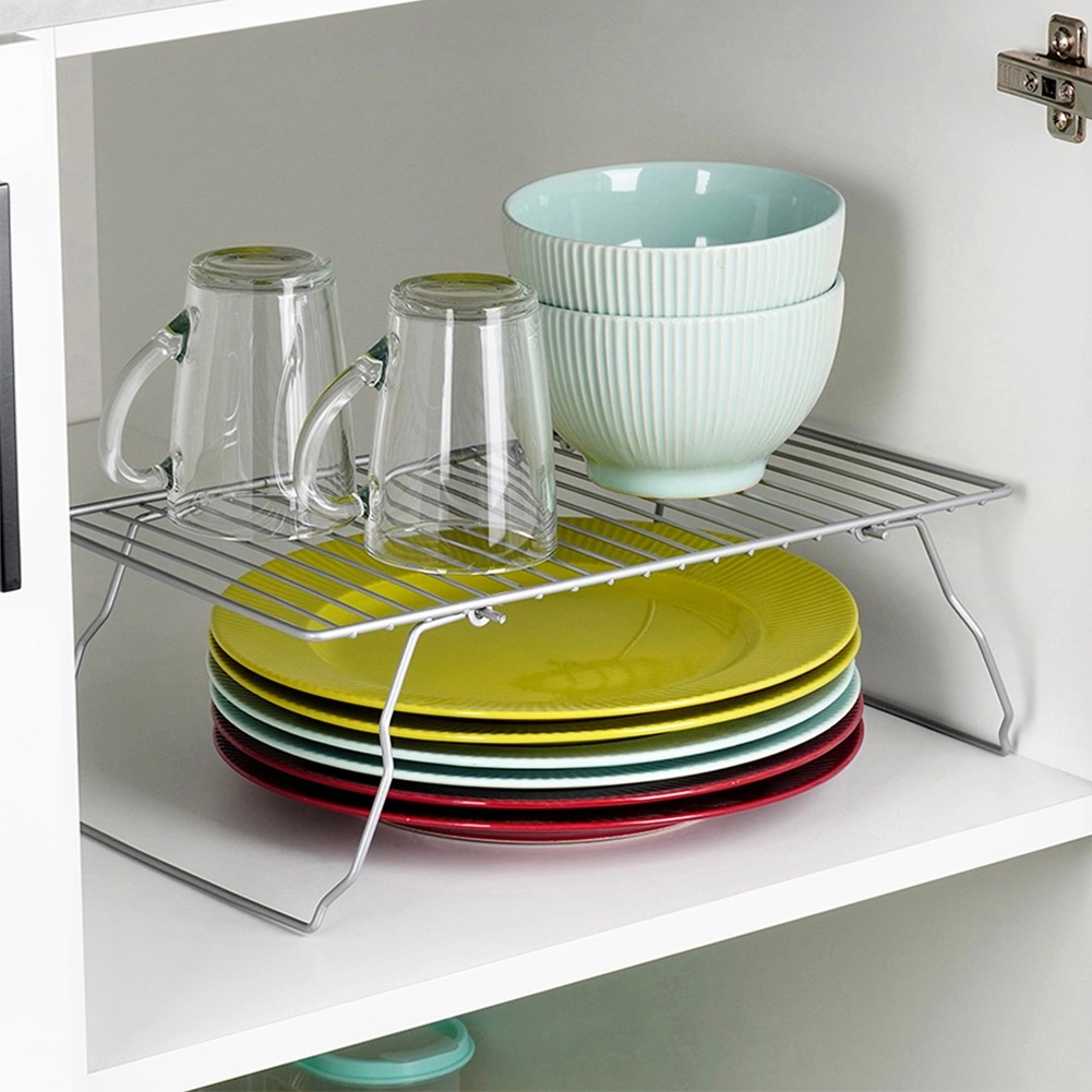 Táto sivá kovová polica do kuchynskej skrinky rozdelí vnútorný priestor na dve poschodia, takže ľahko uložíte taniere, misky aj hrnčeky a využijete maximum výšky skrinky. Skladacie nožičky umožnia bleskové nastavenie a kompaktné uloženie, keď policu práve nepotrebujete.