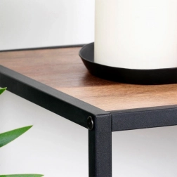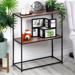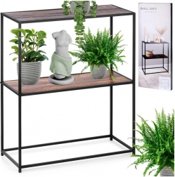 Tento dvojposchodový regál s rozmermi 70 × 30,5 × 85 cm je ideálny na prehľadné uloženie aj štýlové vystavenie dekorácií, kníh, rastlín či kúpeľňových a kuchynských doplnkov. Robustný kovový rám v čiernej farbe v kombinácii s policami z MDF v dekore dreva vytvára moderný industriálny vzhľad, ktorý sa hodí do väčšiny interiérov.