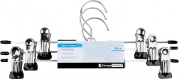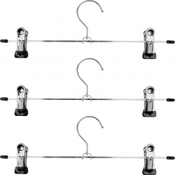 Sada 3 kovových vešiakov s klipsami na prehľadné uloženie nohavíc, sukní aj ďalších odevov. Nastaviteľné posuvné klipsy s gumovými vložkami pevne držia látku bez poškodenia a šetria miesto v skrini. Odolné prevedenie v elegantnej striebornej farbe.