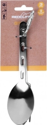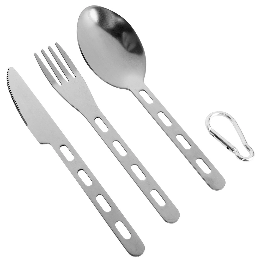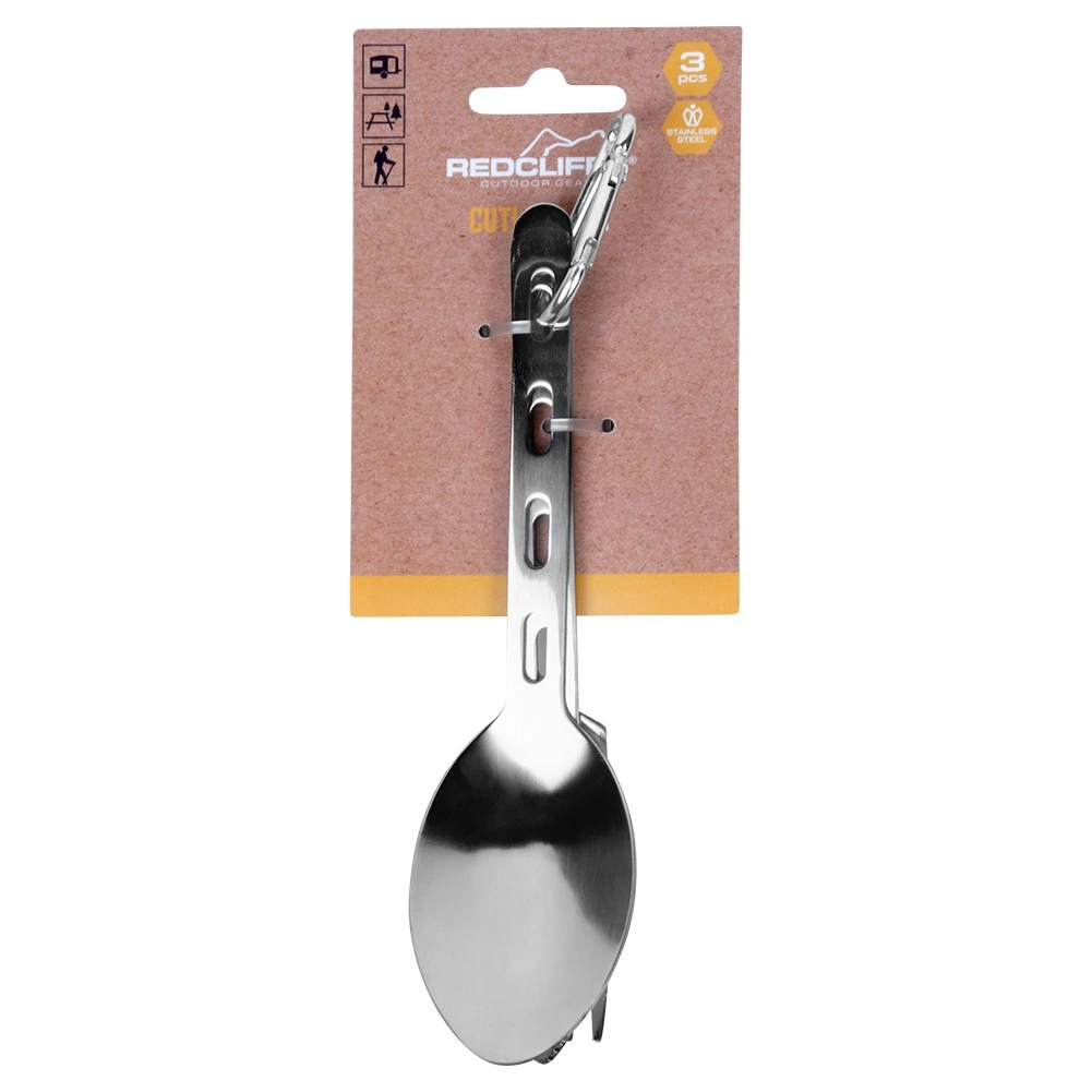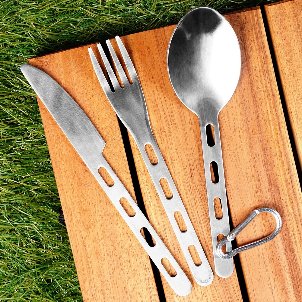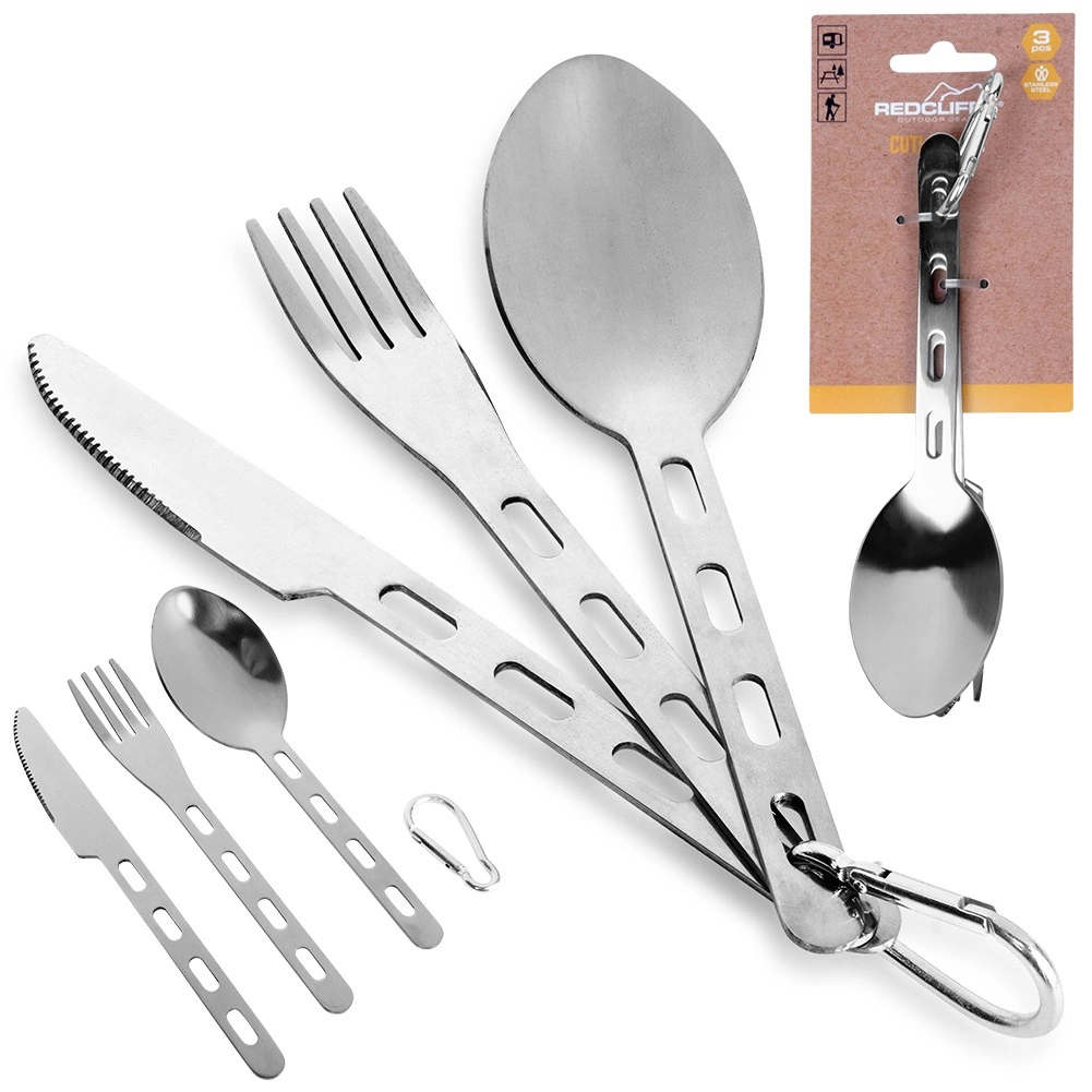 Sada turistického príboru je spoľahlivým spoločníkom pre každé outdoorové dobrodružstvo. Vďaka nehrdzavejúcej oceli je príbor odolný voči korózii, pevný a zároveň ľahko udržiavateľný. Všetky tri časti drží pokope praktická karabína, ktorá uľahčuje zavesenie na batoh či opasok a bráni strate jednotlivých kusov.