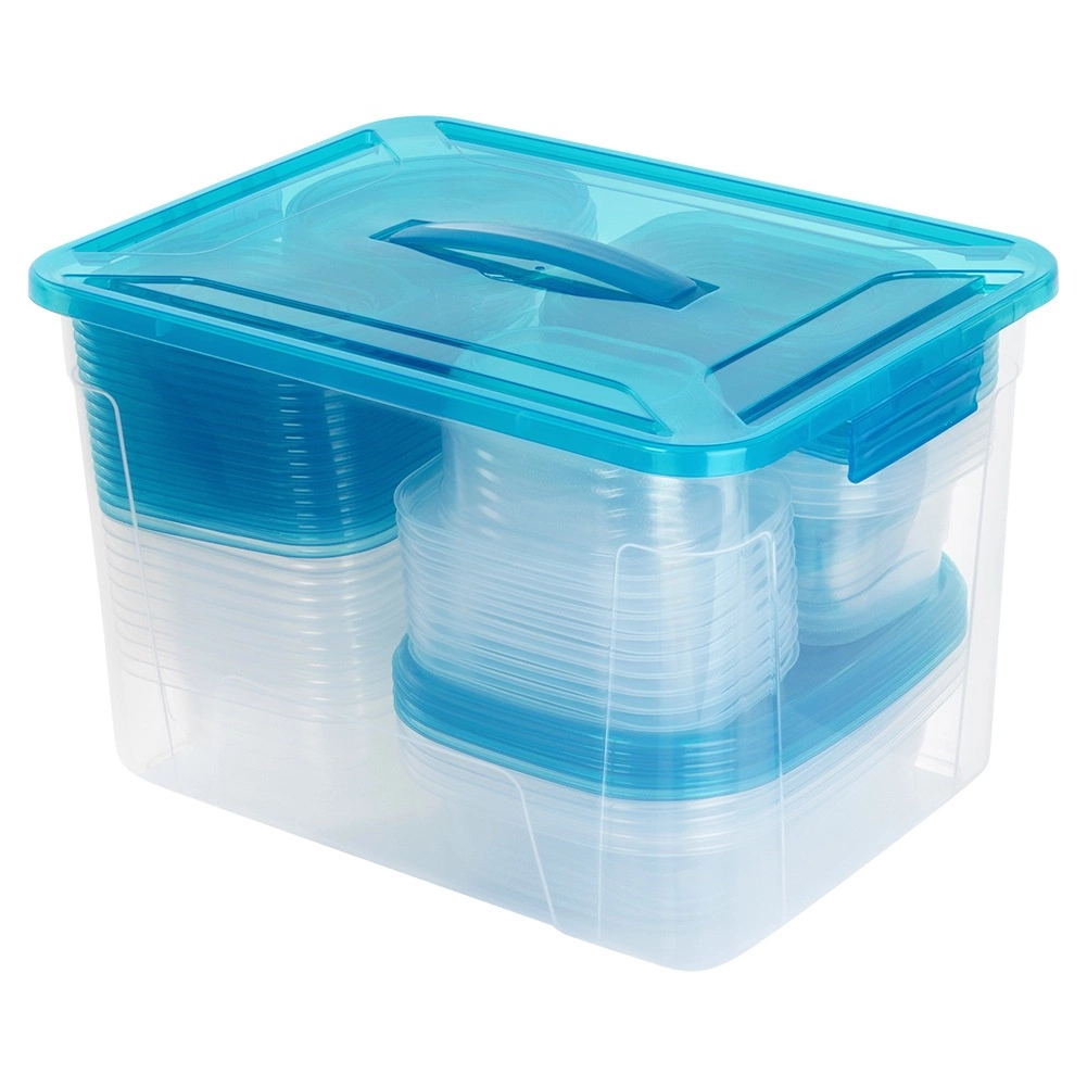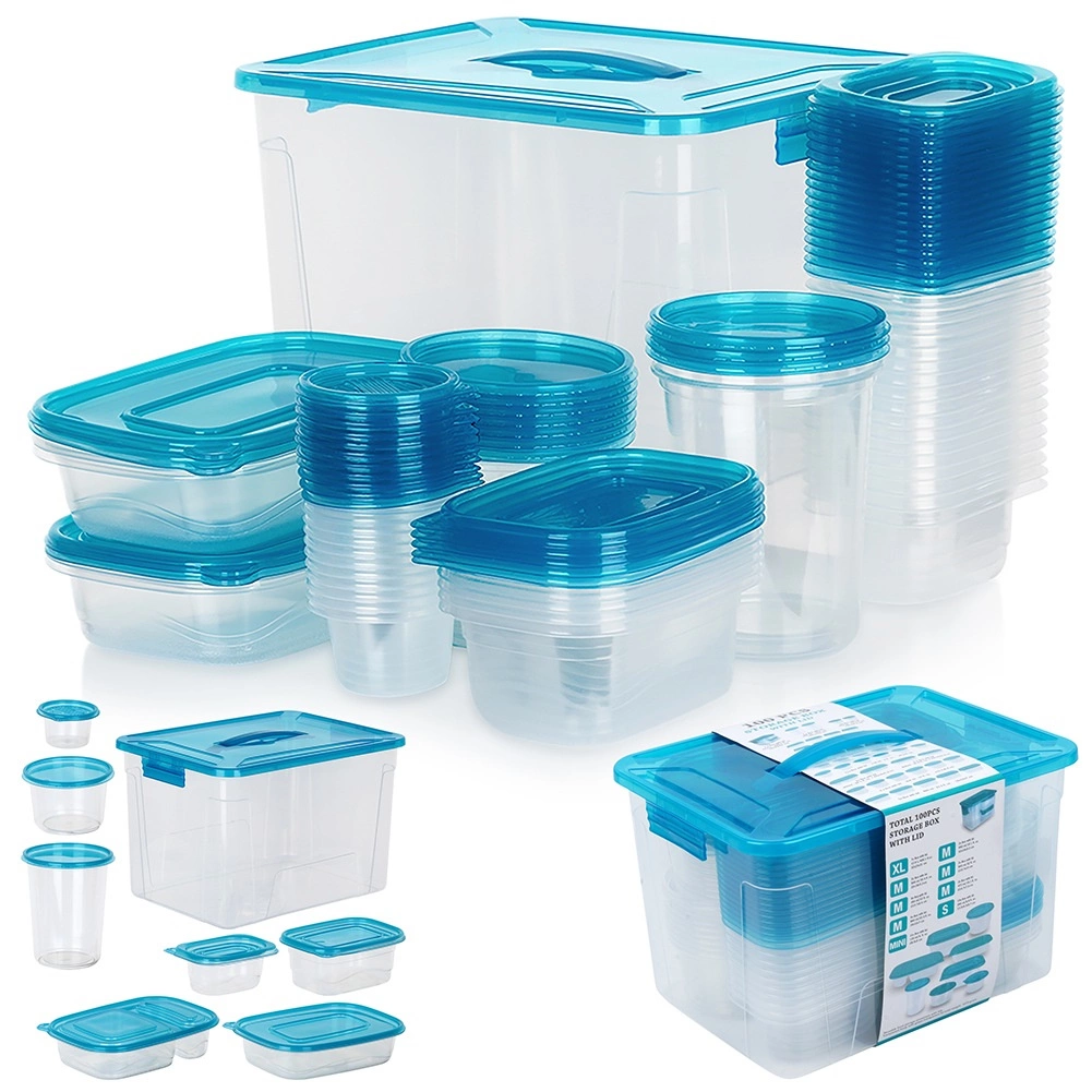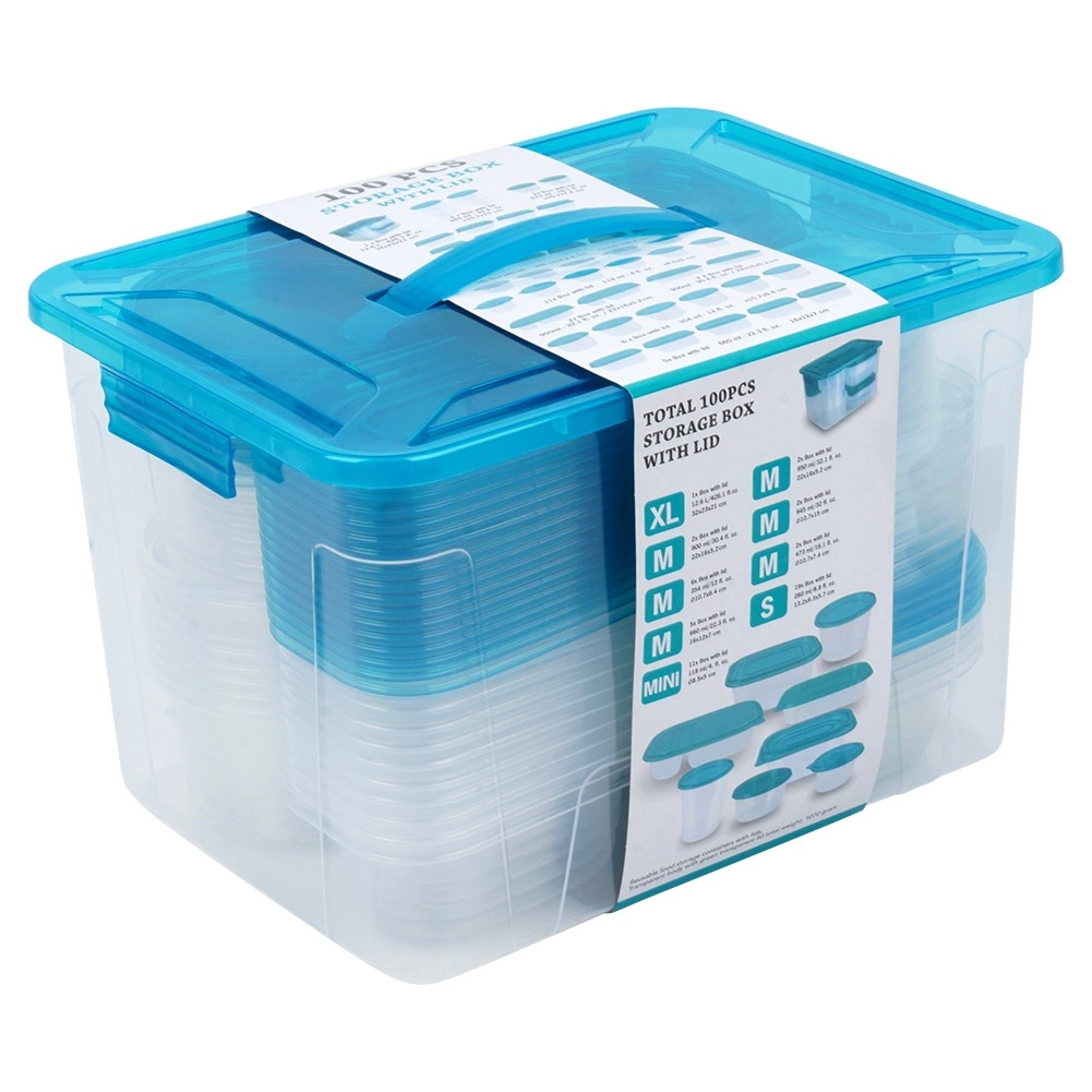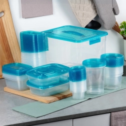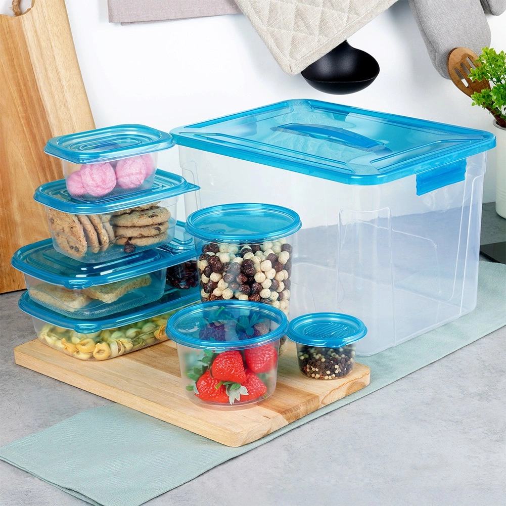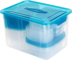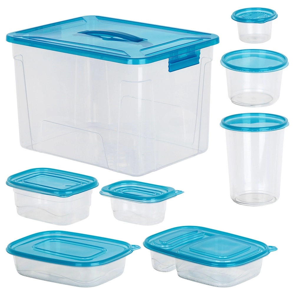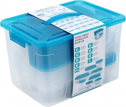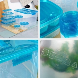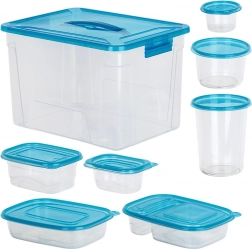 Praktická sada priehľadných dóz na potraviny s modrými viečkami v deviatich veľkostiach na každodenné používanie. Vzduchotesné uzavretie udrží jedlo dlhšie čerstvé, stohovateľný a vkladajúci dizajn šetrí miesto a veľký box s rukoväťou umožní jednoduché uloženie celej sady. Dózy sú bezpečné pre potraviny, vhodné do chladničky, mrazničky, umývačky aj mikrovlnky (ohrev bez viečka).